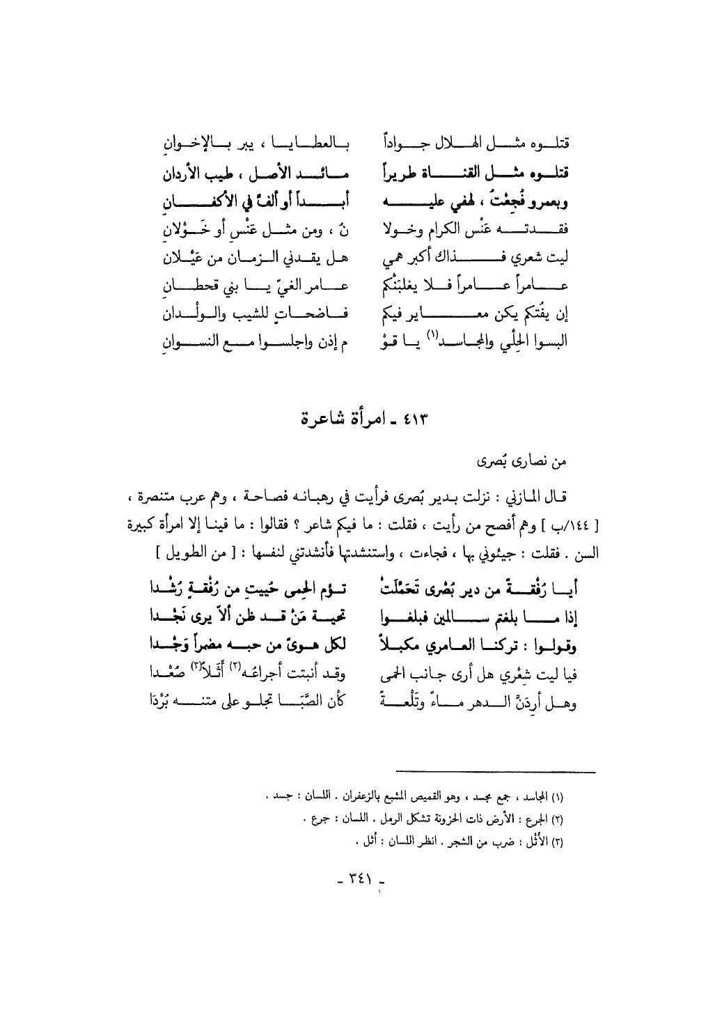 من نصارى بصرى قال المازني: نزلت بدير بصرى فرأيت في رهبانه فصاحة، وهم عرب منتصرة، وهم أفصح من رأيت، فقلت: ما فيكم شاعر؟ فقالوا: ما فينا إلا امرأة كبيرة السن. فقلت: جيئوني بها، فجاءت، واستنشدتها فأنشدتني لنفسها: من الطويل