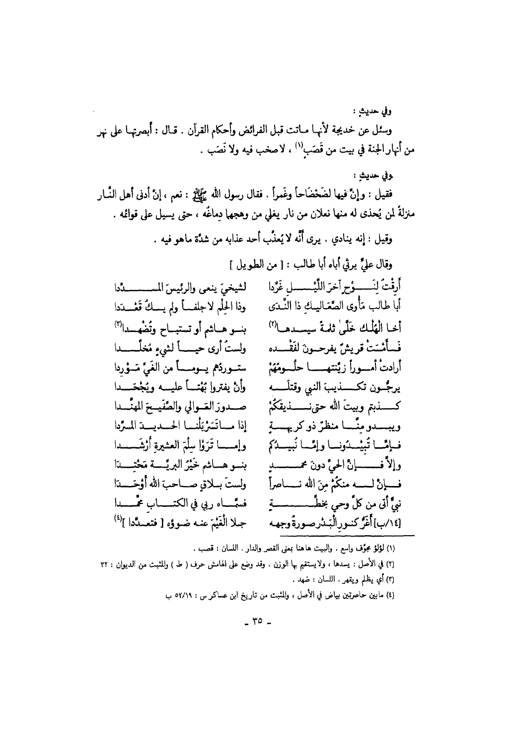 وفي حديث: وسئل عن خديجة لأنها ماتت قبل الفرائض وأحكام القرآن. قال: أبصرتها على نهر من أنهار الجنة في بيت من قصب، لا صخب فيه ولا نصب. وفي حديث: فقيل: إن فيها لضحضاحاً وغمراً. فقال رسول الله صَلَّى اللهُ عَلَيْهِ وَسَلَّمَ: " نعم، إن أدنى أهل النار منزلة لمن يحذى له منها نعلان من نار يغلي من وهجهما دماغه، حتى يسيل على قوائمه. وقيل: إنه ينادي. يرى أنه لا يعذب أحد عذابه من شدة ما هو فيه. وقال علي يرثي أباه أبا طالب: من الطويل