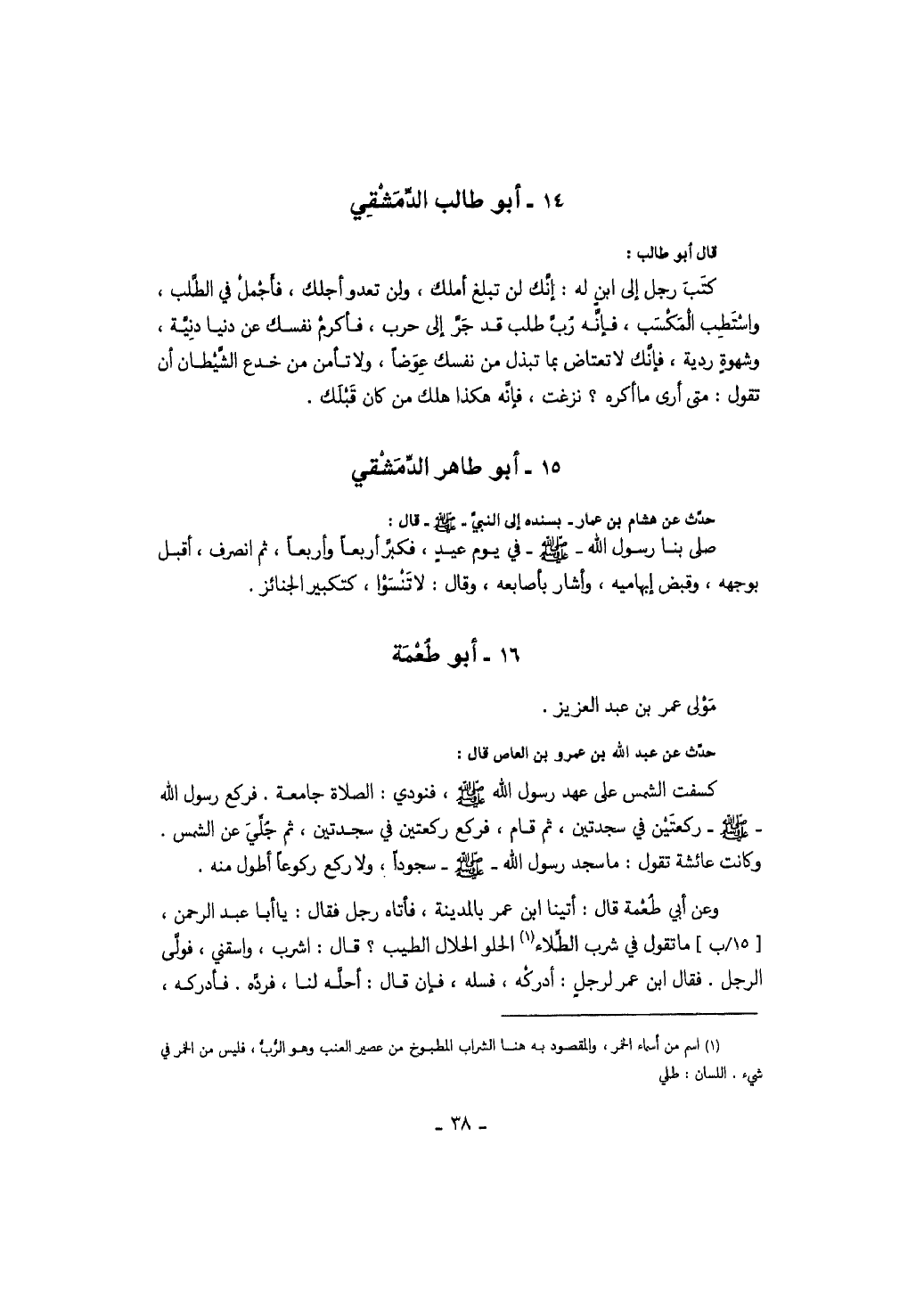 مولى عمر بن عبد العزيز. حدث عن عبد الله بن عمرو بن العاص قال: كسفت الشمس على عهد رسول الله صَلَّى اللهُ عَلَيْهِ وَسَلَّمَ، فنودي: الصلاة جامعة. فركع رسول الله صَلَّى اللهُ عَلَيْهِ وَسَلَّمَ ركعتين في سجدتين، ثم قام، فركع ركعتين في السجدتين، ثم جلي عن الشمس. وكانت عائشة تقول: ما سجد رسول الله صَلَّى اللهُ عَلَيْهِ وَسَلَّمَ سجوداً، ولا ركع ركوعاً أطول منه. وعن أبي طعمة قال: أتينا ابن عمر بالمدينة، فأتاه رجل فقال: يا أبا عبد الرحمن، ما تقول في شرب الطلاء الحلو الحلال الطيب؟ قال: اشرب، واسقني، فولى الرجل. فقال ابن عمر لرجل: أدركه، فسله، فإن قال: أحله لنا، فرده. فأدركه،