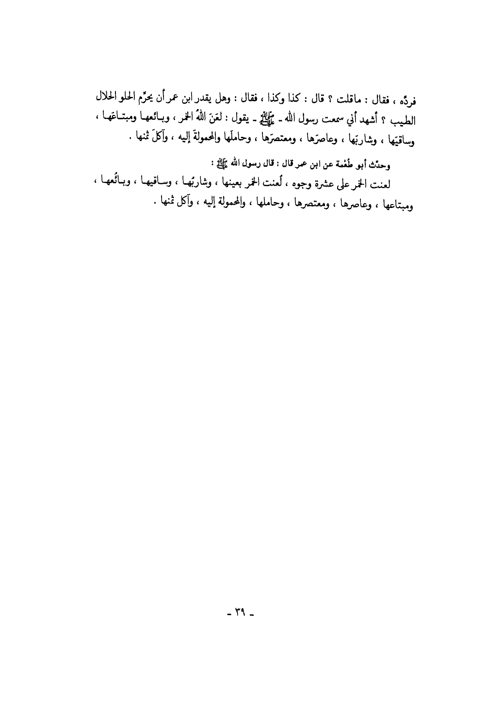 فرده، فقال: ما قلت؟ قال: كذا وكذا، فقال: وهل يقدر ابن عمر أن يحرم الحلو الحلال الطيب؟ أشهد أني سمعت رسول الله صَلَّى اللهُ عَلَيْهِ وَسَلَّمَ يقول: لعن الله الخمر، وبائعها ومبتاعها، وساقيها، وشاربها، وعاصرها، ومعتصرها، وحاملها والمحمولة إليه، وآكل ثمنها. وحدث أبو طعمة عن ابن عمر قال: قال رسول اله صلى لله عليه وسلم: " لعنت الخمر على عشرة وجوه، لعنت الخمر بعينها وشاربها وساقيها، وبائعها، ومبتاعها، وعاصرها، ومعتصرها، وحاملها، والمحمولة إليه، وأكل ثمنها.