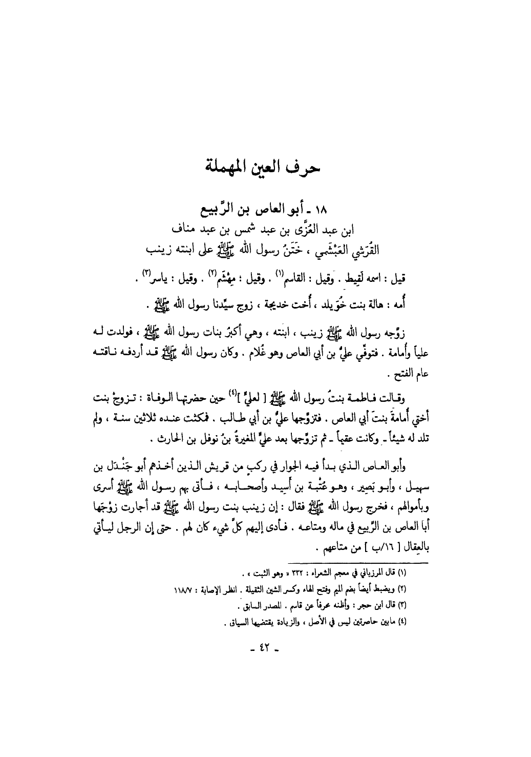 ابن عبد شمس بن عبد مناف القرشي العبشمي، ختن رسول الله صَلَّى اللهُ عَلَيْهِ وَسَلَّمَ على ابنته زينب قيل: اسمه لقيط. وقيل: القاسم. وقيل: مهشم. وقيل: ياسر. أمه هالة بنت خويلد، أخت خديجة، زوج سيدنا رسول الله صَلَّى اللهُ عَلَيْهِ وَسَلَّمَ. زوجه رسول الله صَلَّى اللهُ عَلَيْهِ وَسَلَّمَ زينب، ابنته، وهي أكبر بنات رسول الله صَلَّى اللهُ عَلَيْهِ وَسَلَّمَ، فولدت له علياً وأمامة. فتوفي علي بن أبي العاص وهو غلام. وكان رسول الله صَلَّى اللهُ عَلَيْهِ وَسَلَّمَ قد أردفه ناقته عام الفتح. وقالت فاطمة بنت رسول الله صَلَّى اللهُ عَلَيْهِ وَسَلَّمَ لعلي حين حضرتها الوفاة: تزوج بنت أختي أمامة بنت أبي العاص. فتزوجها علي بن أبي طالب. فمكثت عنده ثلاثين سنة، ولم تلد له شيئاً وكانت عقيماً ثم تزوجها بعد علي المغيرة بن نوفل بن الحارث. وأبو العاص الذي بدأ فيه الجوار في ركب من قريش الذين أخذهم أبو جندل بن سهيل، وأبو بصير، وهو عتبة بن أسيد وأصحابه، فأتى بهم رسول الله صَلَّى اللهُ عَلَيْهِ وَسَلَّمَ أسرى وبأموالهم، فخرج رسول الله صَلَّى اللهُ عَلَيْهِ وَسَلَّمَ فقال: إن زينب بنت رسول الله قد أجارت زوجها أبا العاص بن الربيع في ماله ومتاعه. فأدى إليهم كل شيء كان لهم. حتى إن الرجل ليأتي بالعقال من متاعهم.