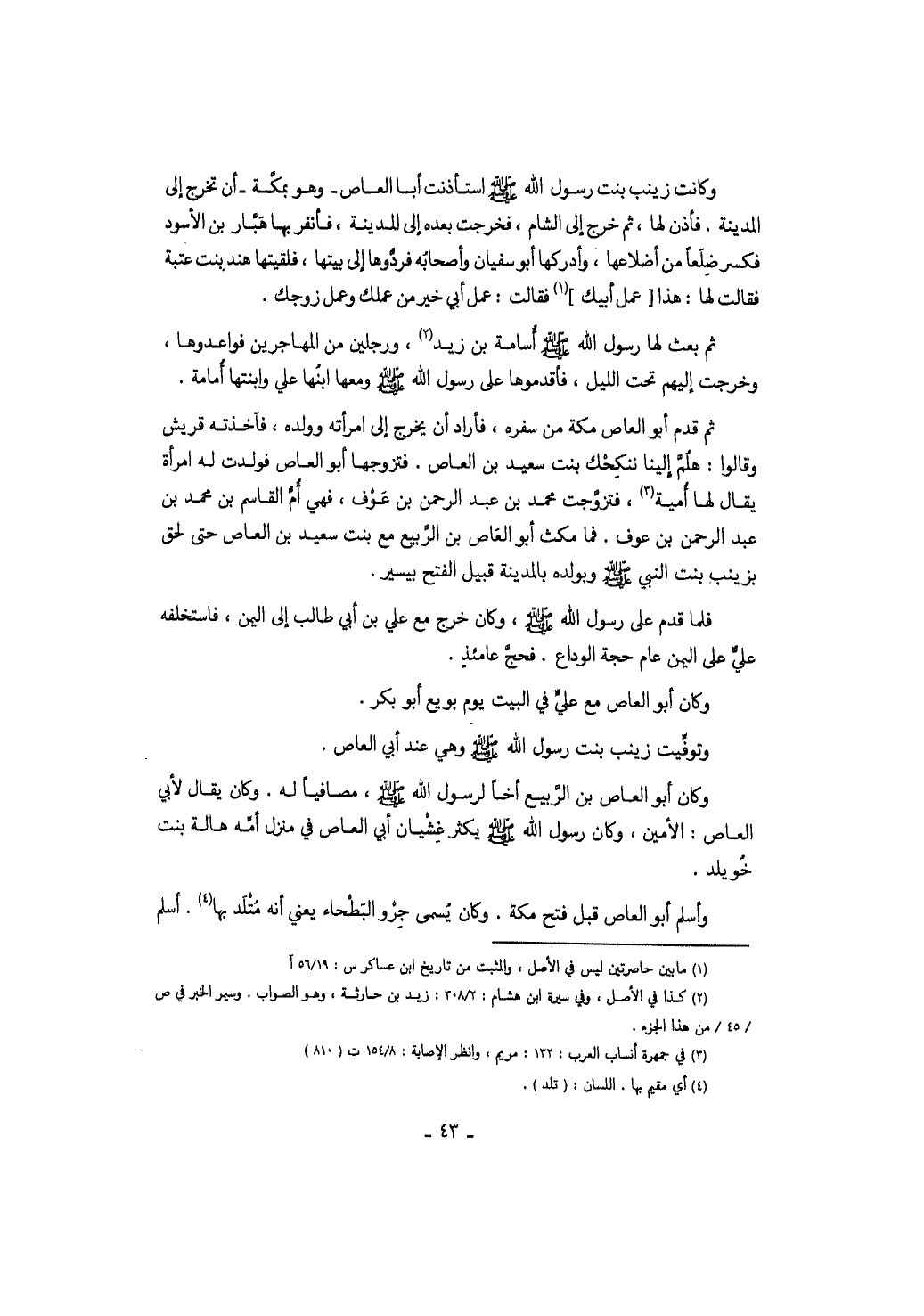 عمل أبي خير من عملك وعمل زوجك. ثم بعث لها رسول الله صَلَّى اللهُ عَلَيْهِ وَسَلَّمَ أسامة بن زيد، ورجلين من المهاجرين فواعدوها، وخرجت إليهم تحت الليل، فأقدموها على رسول الله صَلَّى اللهُ عَلَيْهِ وَسَلَّمَ ومعها ابنها علي وابنتها أمامة. ثم قدم أبو العاص مكة من سفره، فأراد أن يخرج إلى امرأته وولده، فأخذته قريش وقالوا: هلم بنا ننكحك بنت سعيد بن العاص. فتزوجها أبو العاص فولدت له امرأة يقال لها أمية، فتزوجت محمد بن عبد الرحمن بن عوف، فهي أم القاسم بن محمد بن عبد الرحمن بن عوف. فما مكث أبو العاص بن الربيع مع بنت سعيد بن العاص حتى لحق بزينب بنت النبي صَلَّى اللهُ عَلَيْهِ وَسَلَّمَ وبولده بالمدينة قبيل الفتح بيسير. فلما قدم على رسول الله صَلَّى اللهُ عَلَيْهِ وَسَلَّمَ، وكان خرج مع علي بن أبي طالب إلى اليمن، فاستخلفه علي على اليمن عام حجة الوداع. فحج عامه. وكان أبو العاص مع علي في البيت يوم بويع أبو بكر. وتوفيت زينب بنت رسول الله صَلَّى اللهُ عَلَيْهِ وَسَلَّمَ وهي عند أبي العاص. وكان أبو العاص بن الربيع أخاً لرسول الله صَلَّى اللهُ عَلَيْهِ وَسَلَّمَ، مصافياً له. وكان يقال لأبي العاص: الأمين، وكان رسول الله صَلَّى اللهُ عَلَيْهِ وَسَلَّمَ يكثر غشيان أبي العاص في منزل أمه هالة بنت خويلد. وأسلم أبو العاص قبل فتح مكة. وكان يسمى جرو البطحاء يعني أنه متلد بها. أسلم