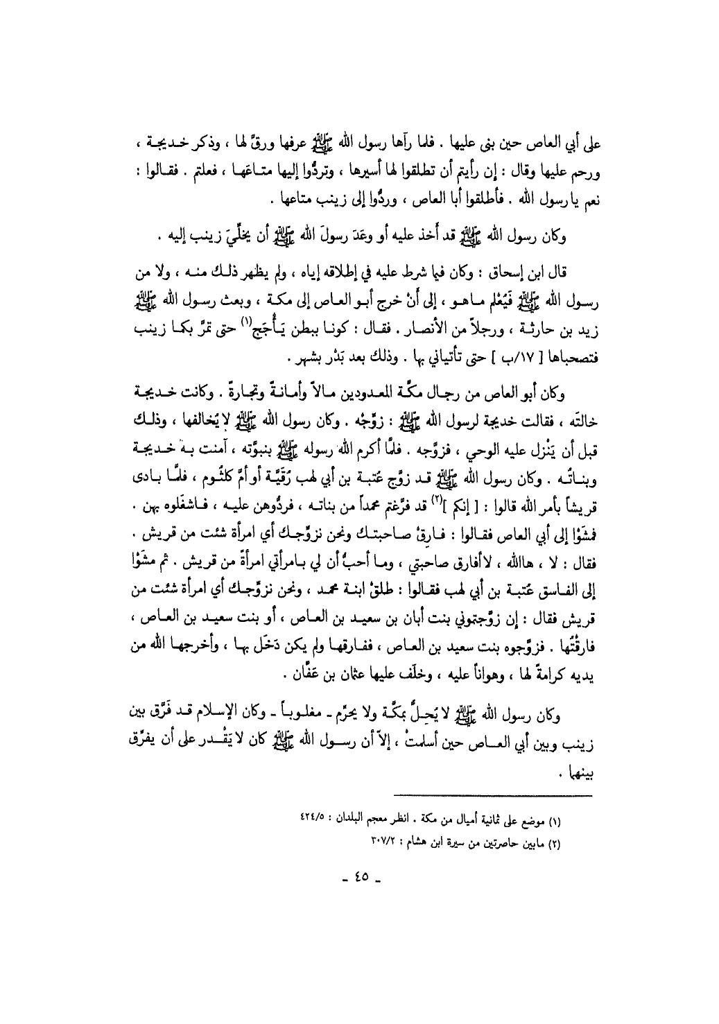 على أبي العاص حين بنى عليها. فلما رآها رسول الله صَلَّى اللهُ عَلَيْهِ وَسَلَّمَ عرفها ورق لها، وذكر خديجة، ورحم عليها وقال: إن رأيتم أن تطلقوا لها أسيرها، وتردوا إليها متاعها، فعلتم. فقالوا: نعم يا رسول الله. فأطلقوا أبا العاص، وردوا إلى زينب متاعها. وكان رسول الله صَلَّى اللهُ عَلَيْهِ وَسَلَّمَ قد أخذ عليه أو وعد رسول الله صَلَّى اللهُ عَلَيْهِ وَسَلَّمَ أن يخلي زينب إليه. قال ابن إسحاق: وكان فيما شرط عليه في إطلاقه إياه، ولم يظهر ذلك منه، ولا من رسول الله صَلَّى اللهُ عَلَيْهِ وَسَلَّمَ فيعلم ما هو، إلى أن خرج أبو العاص إلى مكة، وبعث رسول الله صَلَّى اللهُ عَلَيْهِ وَسَلَّمَ زيد بن حارثة، ورجلاً من الأنصار. فقال: كونا ببطن يأجج حتى تمر بكما زينب فتصحباها حتى تأتياني بها. وذلك بعد بدر بشهر. وكان أبو العاص من رجال مكة المعدودين مالاً وأمانة وتجارةً. وكانت خديجة خالته، فقالت خديجة لرسول الله صَلَّى اللهُ عَلَيْهِ وَسَلَّمَ: زوجه. وكان رسول الله صَلَّى اللهُ عَلَيْهِ وَسَلَّمَ لا يخالفها، وذلك قبل أن ينزل عليه الوحي، فزوجه. فلما أكرم الله رسوله صَلَّى اللهُ عَلَيْهِ وَسَلَّمَ بنبوته، آمنت به خديجة وبناته. وكان رسول الله صَلَّى اللهُ عَلَيْهِ وَسَلَّمَ قد زوج عتبة بن أبي لهب رقية أو أم كلثوم، فلما بادى قريشاً بأمر الله قالوا: إنكم قد فرغتم محمداً من بناته، فردوهن عليه، فاشغلوه بهن. فمشوا إلى أبي العاص فقالوا: فارق صاحبتك ونحن نزوجك أي امرأة شئت من قريش. فقال: لا، ها الله، لا أفارق صاحبتي، وما أحب أن لي بامرأتي امرأة من قريش. ثم مشوا إلى الفاسق عتبة بن أبي لهب فقالوا: طلق ابنة محمد، ونحن نزوجك أي امرأة شئت من قريش. فقال: إن زوجتموني بنت أبان بن سعيد بن العاص، أو بنت سعيد بن العاص، فارقتها. فزوجوه بنت سعيد بن العاص، ففارقها ولم يكن دخل بها، وأخرجها الله من يديه كرامة لها، وهواناً عليه، وخلف عليها عثمان بن عفان. وكان رسول الله صَلَّى اللهُ عَلَيْهِ وَسَلَّمَ لا يحل بمكة ولا يحرم مغلوباً وكان الإسلام قد فرق بين زينب وبين أبي العاص حين أسلمت، إلا أن رسول الله صَلَّى اللهُ عَلَيْهِ وَسَلَّمَ كان لا يقدر على أن يفرق بينهما.