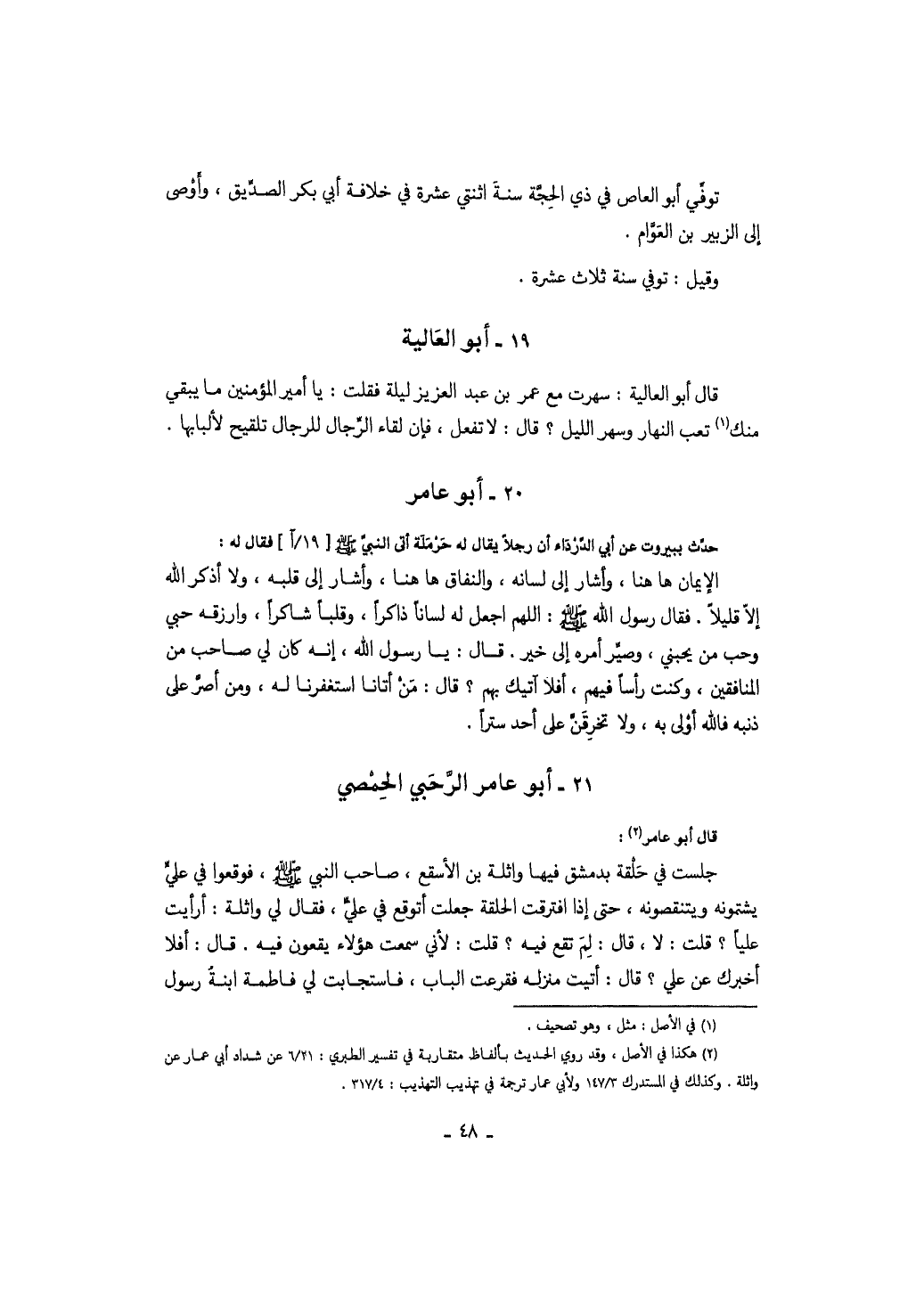 قال أبو عامر: جلست في حلقة بدمشق فيها واثلة بن الأسقع، صاحب النبي صَلَّى اللهُ عَلَيْهِ وَسَلَّمَ، فوقعوا في علي يشتمونه ويتنقصونه، حتى إذا افترقت الحلقة جعلت أتوقع في علي، فقال لي واثلة: أرأيت علياً؟ قلت: لا، قال: لم تقع فيه؟ قلت لأني سمعت هؤلاء يقعون فيه. قال: أفلا أخبرك عن علي؟ قال: أتيت منزله فقرعت الباب، فاستجابت لي فاطمة ابنة رسول
