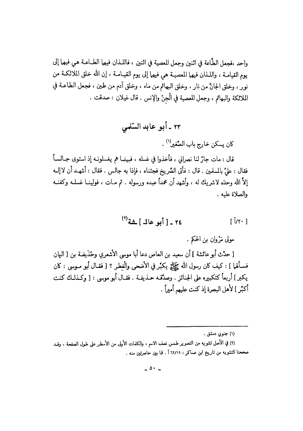 كان يسكن خارج باب الصغير. قال: مات جار لنا نصراني، فأخذوا في غسله، فبينما هم يغسلونه إذ استوى جالساً فقال: علي بالمسلمين. قال: فأتى الصريخ فجئناه، فإذا به جالس. فقال: أشهد أن لا إله إلا الله وحده لا شريك له، وأشهد أن محمداً عبده ورسوله. ثم مات، فولينا غسله وكفنه والصلاة عليه.