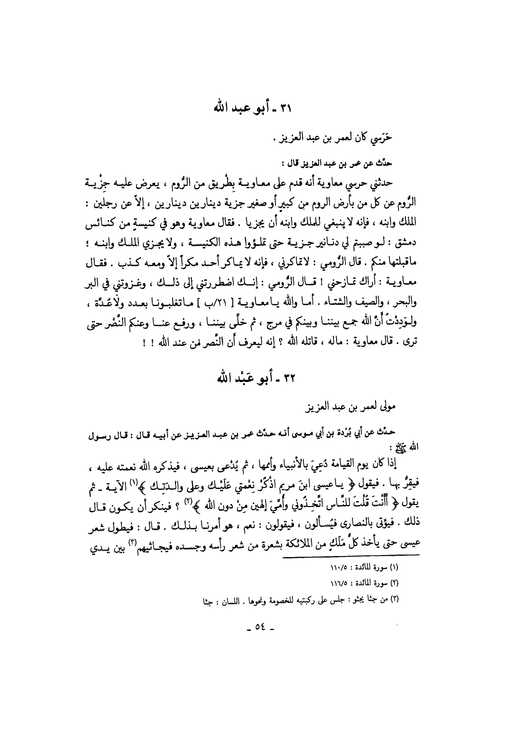 كان لعمر بن عبد العزيز. حدث عن عمر بن عبد العزيز قال: حدثني حرسي معاوية أنه قدم على معاوية بطريق من الروم، يعرض عليه جزية الروم عن كل من بأرض الروم من كبير أو صغير جزية دينارين دينلرين، إلا عن رجلين: الملك وابنه، فإنه لا ينبغي للملك وابنه أن يجزيا. فقال معاوية وهو في كنيسة من كنائس دمشق: لو صببتم لي دنانير جزية حتى تملؤوا هذه الكنيسة، ولا يجزى الملك وابنه؛ ما قبلتها منكم. قال الرومي: لا تماكرني، فإنه لا يماكر أحد مكراً إلا ومعه كذب. فقال معاوية: أراك تمازحني! قال الرومي: إنك اضطررتني إلى ذلك، وغزوتني في البر والبحر، والصيف والشتاء. أما والله يا معاوية لا تغلبونا لا بعدد ولا عدة، ولوددت أن الله جمع بيننا وبينكم في مرج، ثم خلى بيننا، ورفع عنا وعنكم النصر حتى ترى. قال معاوية: ما له، قاتله الله؟ إنه ليعرف أن النصر من عند الله!!