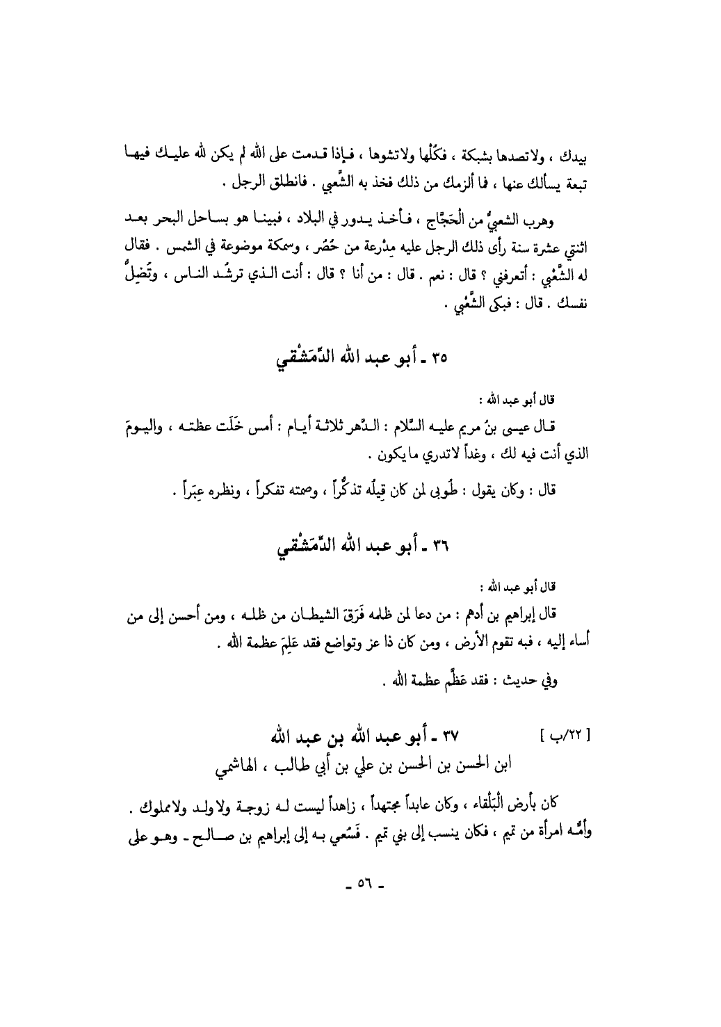 بيدك، ولا تصدها بشبكة، فكلها ولا تشوها، فإذا قدمت على الله لم يكن لله عليك فيها تبعة يسألك عنها، فما ألزمك من ذلك فخذ به الشعبي. فانطلق الرجل. وهرب الشعبي من الحجاج، فأخذ يدور في البلاد، فبينا هو بساحل البحر بعد اثنتي عشرة سنة رأى ذلك الرجل عليه مدرعة من حصر، وسمكة موضوعة في الشمس. فقال له الشعبي: أتعرفني؟ قال: نعم. قال: من أنا؟ قال: أنت الذي ترشد الناس، وتضل نفسك. قال: فبكى الشعبي.