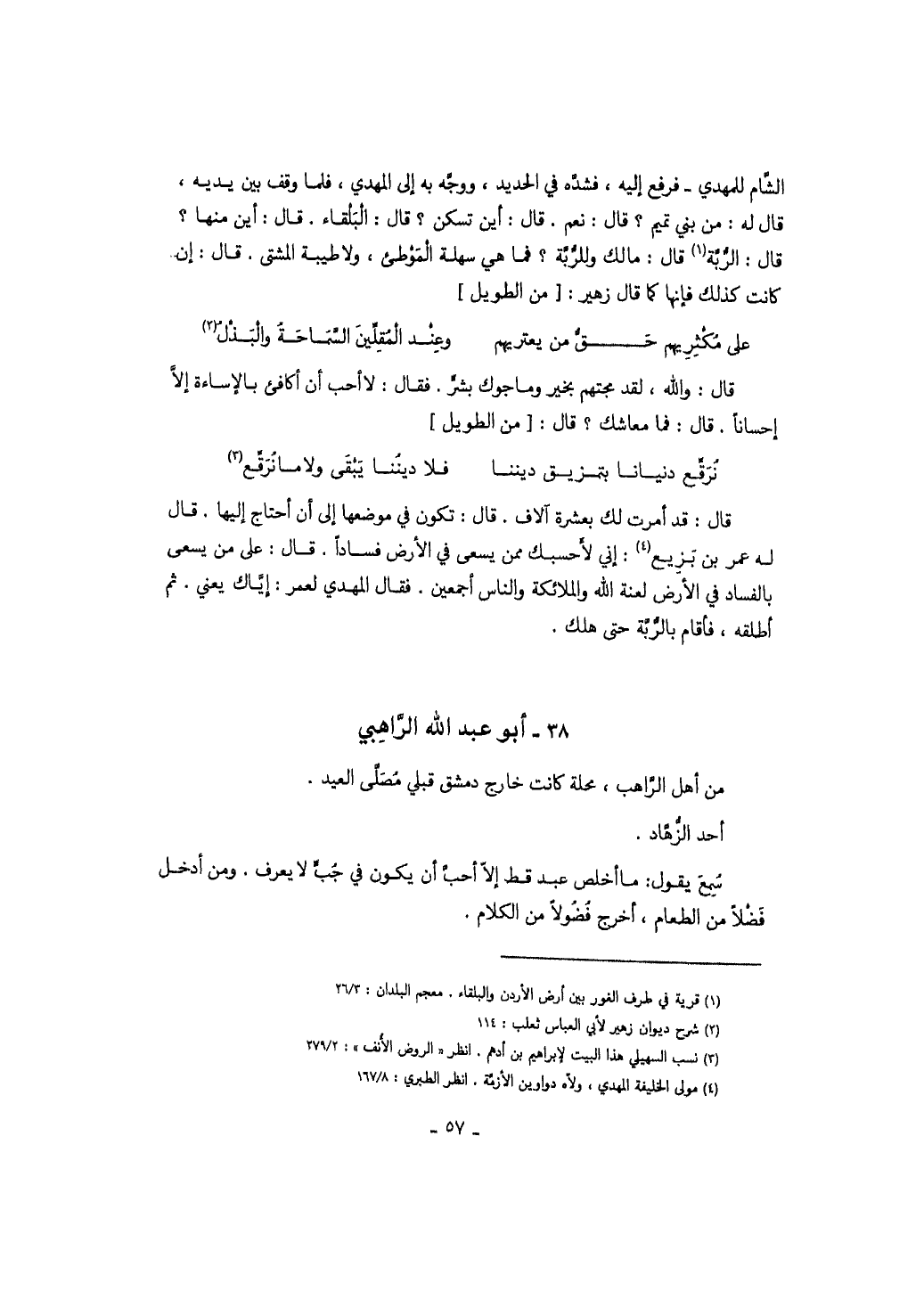من بني تميم؟ قال: نعم. قال: أين تسكن؟ قال: البلقاء. قال: أين منها؟ قال: الربة قال: ما لك وللربة؟ فما هي سهلة الموطئ، ولا طيبة المشتى. قال: إن كانت كذلك فإنها كما قال زهير: من الطويل