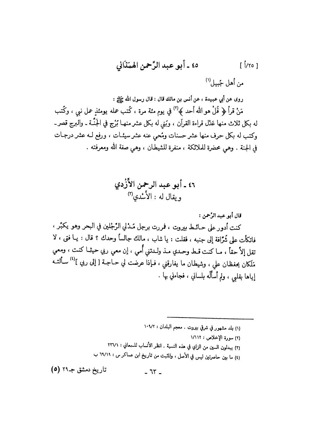 من أهل جبيل روى عن أبي عبيدة، عن أنس بن مالك قال: قال رسول الله صَلَّى اللهُ عَلَيْهِ وَسَلَّمَ: من قرأ " قل هو الله أحد " في يوم مئة مرة، كتب عمله يومئذ عمل نبي، وكتب له بكل ثلاث منها عدل قراءة القرآن، وبني له بكل عشر منها برج في الجنة والبرج قصر وكتب له بكل حرف منها عشر حسنات ومحي عنه عشر سيئات، ورفع له عشر درجات في الجنة. وهي محضرة للملائكة، منفرة للشيطان، وهي صفة الله ومعرفته.