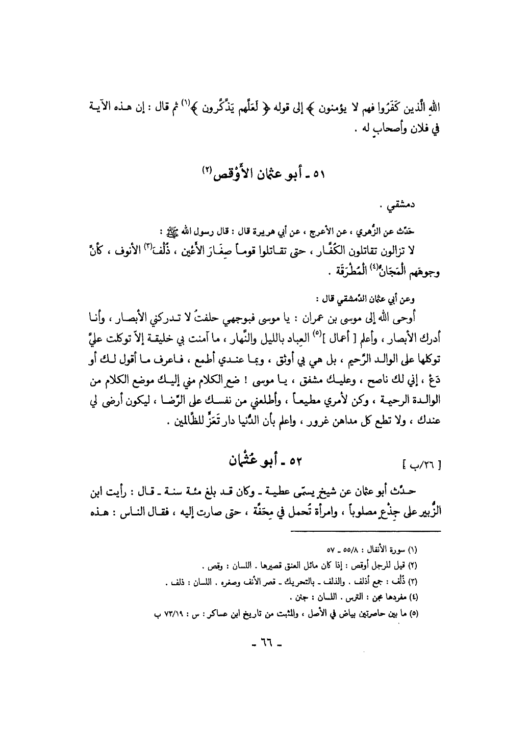 دمشقي. حدث عن الأزهري، عن الأعرج، عن أبي هريرة قال: قال رسول الله صَلَّى اللهُ عَلَيْهِ وَسَلَّمَ: لا تزالون تقاتلون الكفار، حتى تقاتلوا قوماً صغار الأعين، ذلف الأنوف، كأن وجوههم المجان المطرقة. وعن أبي عثمان الدمشقي قال: أوحى الله إلى موسى بن عمران: يا موسى فبوجهي حلفت لا تدركني الأبصار، وأنا أدرك الأبصار، وأعلم أعمال العباد بالليل والنهار، ما آمنت بي خليقة إلا توكلت علي توكلها على الوالد الرحيم، بل هي بي أوثق، وبما عندي أطمع، فأعرف ما أقول لك أو دع، إني لك ناصح، وعليك مشفق، يا موسى! ضع الكلام مني إليك موضع الكلام من الوالدة الرحيمة، وكن لأمري مطيعاً، وأطلعني من نفسك على الرضا، ليكون أرضى لي عندك، ولا تطع كل مداهن غرور، واعلم بأن الدنيا دار تعز للظالمين.