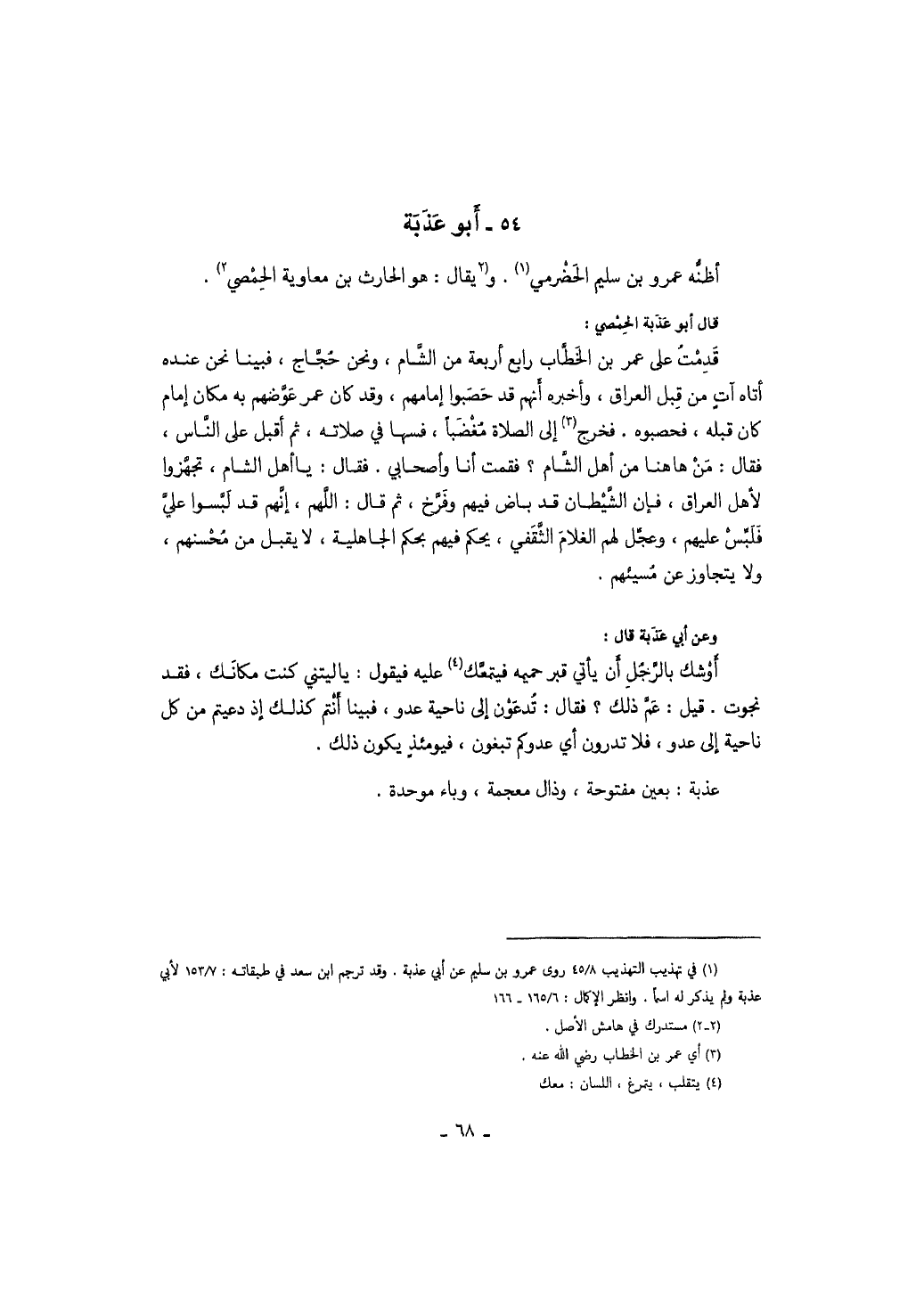 أظنه عمرو بن سليم الحضرمي. ويقال: هو الحارث بن معاوية الحمصي. قال أبو عذبة الحمصي: قدمت على عمر بن الخطاب رابع أربعة من الشام، ونحن حجاج، فبينا نحن عنده أتاه آت من بلاد العراق، وأخبره أنهم قد حصبوا إمامهم، وقد كان عمر عوضهم به مكان إمام كان قبله، فحصبوه. فخرج إلى الصلاة مغضباً، فسها في صلاته، ثم أقبل على الناس، فقال: من ها هنا من أهل الشام؟ فقمت أنا وأصحابي. فقال: يا أهل الشام، تجهزوا لأهل العراق، فإن الشيطان قد باض فيهم وفرخ، ثم قال: اللهم إنهم قد لبسوا علي فلبس عليهم، وعجل لهم الغلام الثقفي، يحكم فيهم بحكم الجاهلية، ولا يقبل من محسنهم، ولا يتجاوز عن مسيئهم. وعن أبي عذبة قال: أوشك بالرجل أن يأتي قبر حميمه فيتمعك عليه فيقول: يا ليتني كنت مكانك، فقد نجوت. قيل: عم ذلك؟ فقال: تدعون إلى ناحية عدو، فبينا أنتم كذلك إذ دعيتم من كل ناحية إلى عدو، فلا تدرون أي عدوكم تبغون، فيومئذ يكون ذلك. عذبة: بعين مفتوحة، وذال معجمة، وباء موحدة.