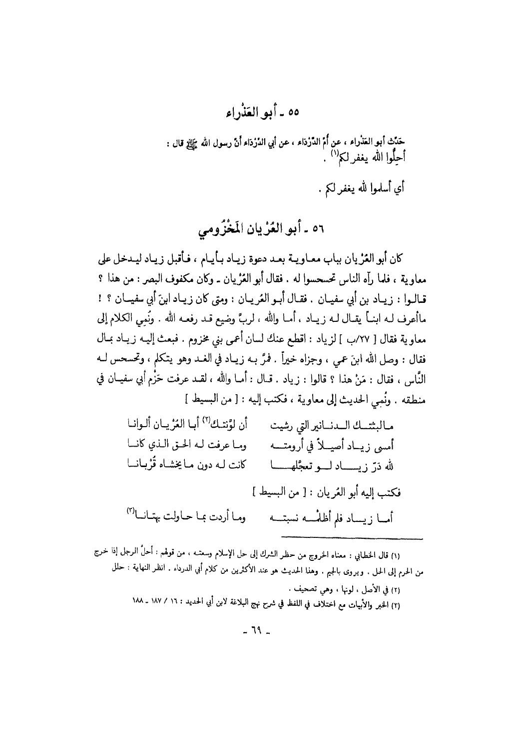 كان أبو العريان بباب معاوية بعد دعوة زياد بأيام، فأقبل زياد ليدخل على معاوية، فلما رآه الناس تحسسوا له. فقال أبو العريان وكان مكفوف البصر: من هذا؟ قالوا زياد بن أبي سفيان. فقال أبو العريان: ومتى كان زياد ابن أبي سفيان؟! ما أعرف له ابناً يقال له زياد، أما والله، لرب وضيع قد رفعه الله. ونمي الكلام إلى معاوية فقال لزياد: اقطع عنك لسان أعمى بني مخزوم. فبعث إليه زياد بمال فقال: وصل الله ابن عمي، وجزاه خيراً. فمر به زياد في الغد وهو يتكلم، وتحسحس له الناس، فقال: من هذا؟ قالوا: زياد. قال: أما والله قد عرفت حزم أبي سفيان في منطقه. ونمى الحديث إلى معاوية، فكتب إليه: من البسيط