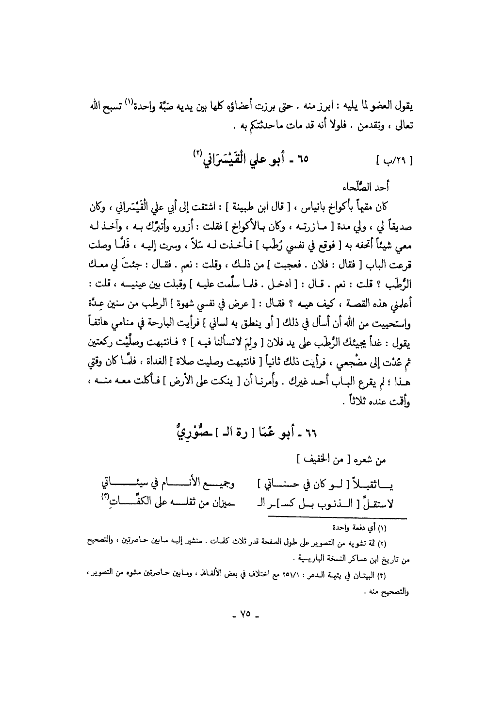 أحد الصلحاء كان مقيماً بأكواخ بانياس، قال ابن طبينة: اشتقت إلى أبي علي القيسراني. وكان صديقاً لي، ولي مدة ما زرته، وكان بالأكواخ فقلت: أزوره وأتبرك به، وآخذ له معي شيئاً أتحفه به فوقع في نفسي رطب فأخذت له سلاً، وسرت إليه، فلما وصلت قرعت الباب فقال: فلان. فعجبت من ذلك، وقلت: نعم. فقال: جئت لي معك الرطب؟ قلت: نعم. قال: ادخل. فلما سلمت عليه وقبلت بين عينيه، قلت: أعلمني هذه القصة، كيف هيه؟ فقال: عرض في نفسي شهوة الرطب من سنين عدة واستحييت من الله أن أسأل في ذلك أو ينطق به لساني فرأيت البارحة في منامي هاتفاً يقول: غداً يجيئك الرطب على يد فلان ولم لا تسألنا فيه؟ فانتبهت وصليت ركعتين ثم عدت إلى مضجعي، فرأيت ذلك ثانياً فانتبهت وصليت صلاة الغداة، فلما كان وقتي هذا؛ لم يقرع الباب أحد غيرك. وأمرنا أن ينكت على الأرض فأكلت معه منه، وأقمت عنده ثلاثاً.