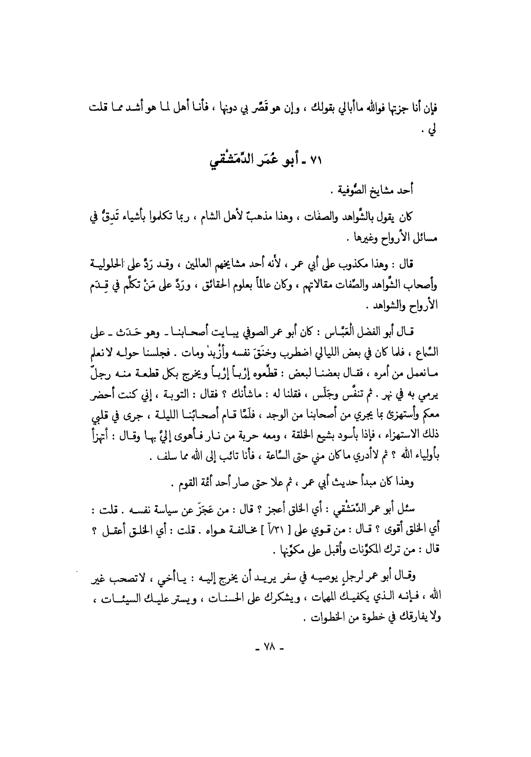 أحد مشايخ الصوفية. كان يقول بالشواهد والصفات، وهذا مذهب لأهل الشام، ربما تكلموا بأشياء تدق في مسائل الأرواح وغيرها. قال: وهذا مكذوب على أبي عمر، لأنه أحد مشايخهم العالمين، وقد رد على الحلولية وأصحاب الشواهد والصفات مقالاتهم، وكان عالماً بعلوم الحقائق، ورد على من تكلم في قدم الأرواح والشواهد. قال أبو الفضل العباس: كان أبو عمر الصوفي يبايت أصحابنا وهو حدث على السماع، فلما كان في بعض الليالي اضطرب وخنق نفسه وأزبد ومات. فجلسنا حوله لا نعلم ما نعمل من أمره، فقال بعضنا لبعض: قطعوه إرباً إرباً ويخرج بكل قطعة منه رجل يرمي به في نهر. ثم تنفس وجلس، فقلنا له: ما شأنك؟ فقال: التوبة، إني كنت أحضر معكم وأستهزىء بما يجري من أصحابنا من الوجد، فلما قام أصحابنا الليلة، جرى في قلبي ذلك الإستهزاء، فإذا بأسود بشيع الخلقة، ومعه حربة من نار فأهوى إلي بها وقال: أتهزأ بأولياء الله؟ ثم لا أدري ما كان مني حتى الساعة، فأنا تائب إلى الله مما سلف. وهذا كان مبدأ حديث أبي عمر، ثم علا حتى صار أحد أئمة القوم.
