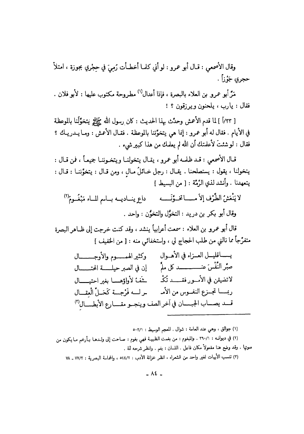 مر أبو عمر بن العلاء بالبصرة، فإذا أعدال مطروحة مكتوب عليها: لأبو فلان. فقال: يا رب، يلحنون ويرزقون؟! لما قدم الأعمش وحدث بهذا الحديث: كان رسول الله صَلَّى اللهُ عَلَيْهِ وَسَلَّمَ يتخولنا بالموعظة في الأيام. فقال له أبو عمرو: إنما هي يتخوننا بالموعظة. فقال الأعمش: وما يدريك؟ فقال: لو شئت لأعلمتك أن الله لم يعلمك من هذا كبير شيء. قال الأصمعي: قد ظلمه أبو عمرو، يقال يتخولنا ويتخوننا جميعاً، فمن قال: يتخولنا، يقول يستصلحنا. يقال: رجل خائل مالٍ، ومن قال: يتخوننا: قال: يتعهدنا. وأنشد لذي الرمة: من البسيط