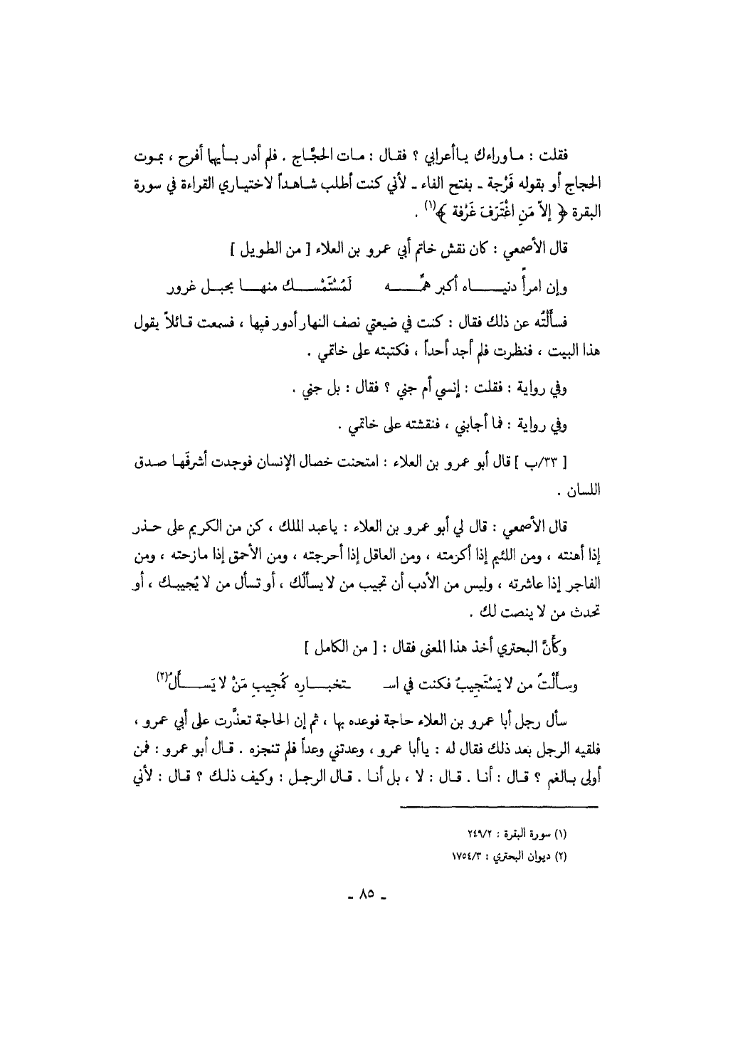 فقلت: ما وراءك يا أعرابي؟ فقال: مات الحجاج. فلم أدر بأيهما أفرح، بموت الحجاج أو بقوله فرجة بفتح الفاء لأني كنت أطلب شاهداً لاختياري القراءة في سورة البقرة " إلا من اغترف غرفة ". قال الأصمعي: كان نقش خاتم أب عمرو بن العلاء من الطويل