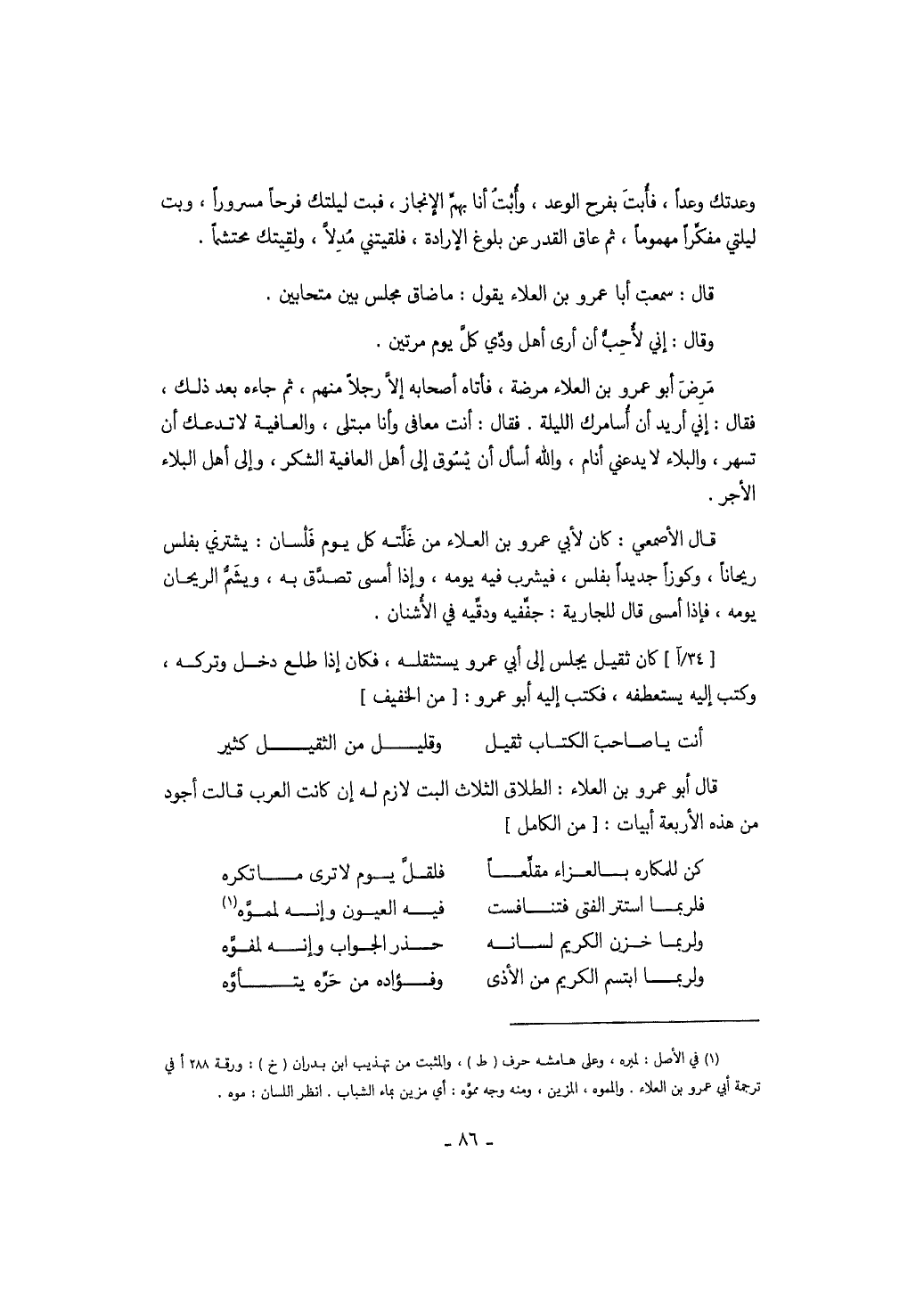 وعدتك وعداً، فأبت بفرح الوعد، وأبت أنا بهم الإنجاز، فبت ليلتك فرحاً مسروراً، وبت ليلتي مفكراً مهموماً، ثم عاق القدر عن بلوغ الإرادة، فلقيتني مدلاً، ولقيتك محتشماً. قال: سمعت أبا عمرو بن العلاء يقول: ما ضاق مجلس بي متحابين. وقال: إني لأحب أن أرى أهل ودي كل يوم مرتين. مرض أبو عمرو بن العلاء مرضة، فأتاه أصحابه إلا رجلاً منهم، ثم جاءه بعد ذلك، فقال: إني أريد أن أسامرك الليلة. فقال: أنت معافى وأنا مبتلي، والعافية لا تدعوك أن تسهر، والبلاء لا يدعني أنام، والله أسال أن يسوق إلي أهل العافية والشكر، وإلى أهل البلاء الأجر. قال الأصمعي:
