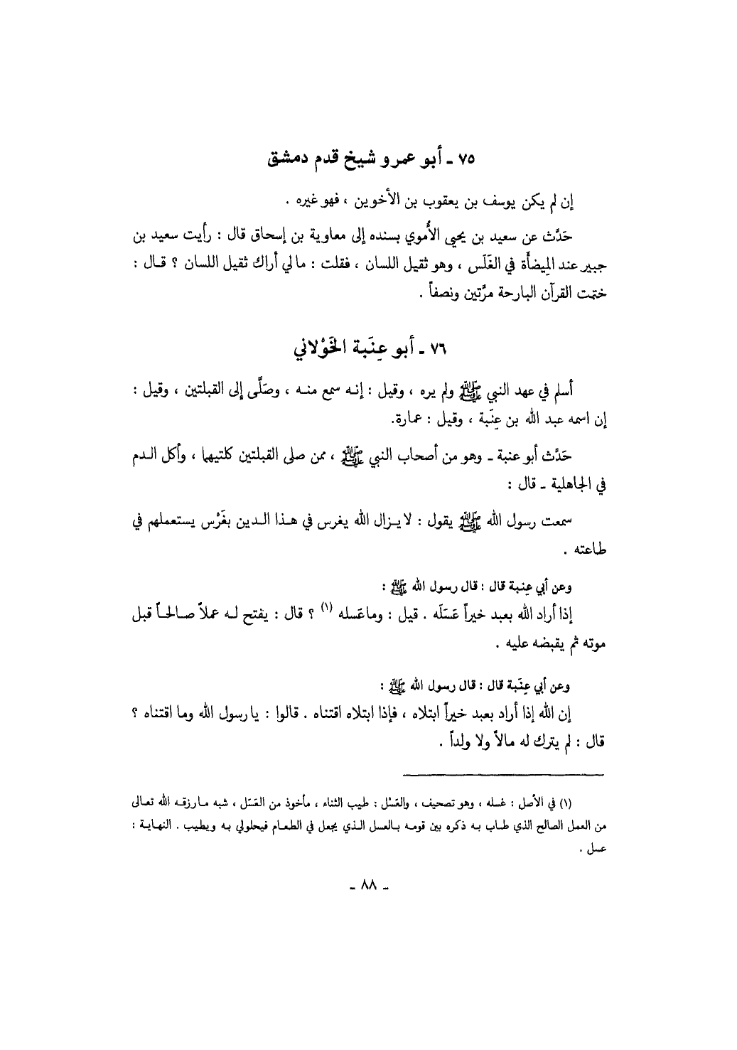 أسلم في عهد النبي صَلَّى اللهُ عَلَيْهِ وَسَلَّمَ ولم يره، وقيل: إنه سمع منه، وصلى إلى القبلتين، وقيل: إن اسمه عبد الله بن عنبة، وقيل: عمارة. حدث أبو عنبة وهو من أصحاب النبي صَلَّى اللهُ عَلَيْهِ وَسَلَّمَ، ممن صلى القبلتين كلتيهما، وأكل الدم في الجاهلية قال: سمعت رسول الله صَلَّى اللهُ عَلَيْهِ وَسَلَّمَ يقول: لا يزال الله يغرس في هذا الدين بغرس يستعملهم في طاعته. وعن أبي عنبة قال: قال رسول الله صَلَّى اللهُ عَلَيْهِ وَسَلَّمَ: إذا أراد الله بعبد خيراً عسله. قيل: وما عسله؟ قال: يفتح له عملاً صالحاً قبل موته ثم يقبضه عليه. وعن أبي عنبة قال: قال رسول الله صَلَّى اللهُ عَلَيْهِ وَسَلَّمَ: إن الله إذا أراد بعبد خيراً ابتلاه، فإذا ابتلاه اقتناه. قالوا: يا رسول الله وما اقتناه؟ قال: لم يترك له مالاً ولا ولداً.