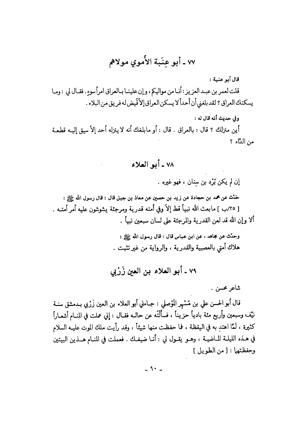إن لم يكن برد بن سنان، فهو غيره. حدث عن محمد بن حجادة عن بن زيد بن حصين عن معاذ بن جبل قال: قال رسول الله صَلَّى اللهُ عَلَيْهِ وَسَلَّمَ: ما بعث الله نبياً قط إلا وفي أمته قدرية ومرجئة يشوشون عليه أمر أمته. ألا وإن الله قد لعن القدرية والمرجئة على لسان سبعين نبياً. وحدث عن مجاهد، عن ابن عباس قال: قال رسول الله صَلَّى اللهُ عَلَيْهِ وَسَلَّمَ: هلاك أمتي بالعصبية والقدرية، والرواية من غير تثبت.