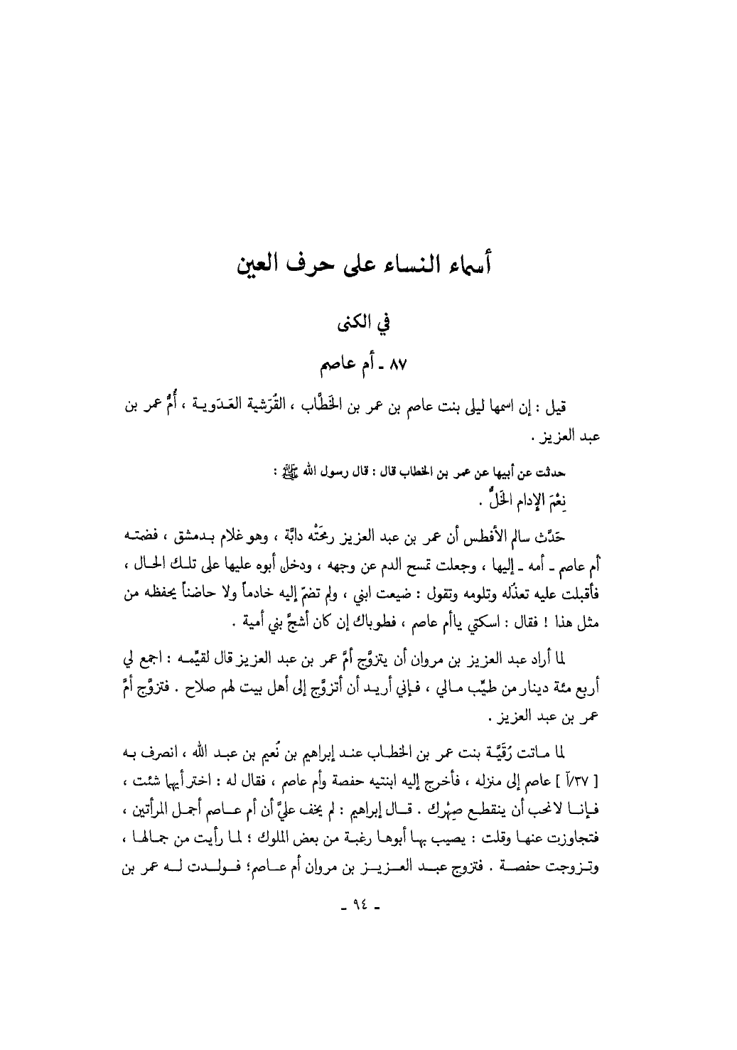 لما أراد عبد العزيز بن مروان أن يتزوج أم عمر بن عبد العزيز قال لقيمة: اجمع لي أربع مئة دينار من طيب مالي، فإني أريد أن أتزوج إلى أهل بيت لهم صلاح. فتزوج أم عمر بن عبد العزيز. لما ماتت رقية بنت عمر بن الخطاب عند إبراهيم بن نعيم بن عبد الله، انصرف به عاصم إلى منزله، فأخرج إليه ابنتيه حفصة وأم عاصم، فقال له: اختر أيهما شئت فإنا لا نحب أن ينقطع صهرك. قال إبراهيم: لم يخف علي أن أم عاصم أجمل المرأتين، فتجاوزت عنها وقلت: يصيب بها أبوها رغبة من بعض الملوك؛ لما رأيت من جمالها، وتزوجت حفصة. فتزوج عبد العزيز بن مروان أم عاصم؛ فولدت له عمر بن