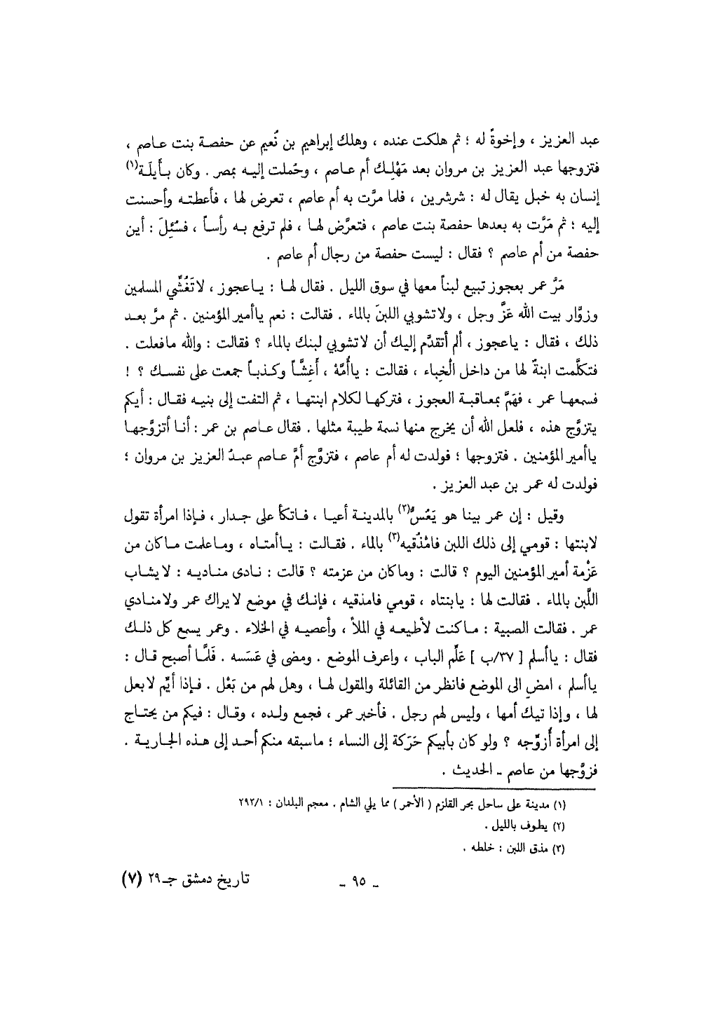 عبد العزيز، وإخوة له؛ ثم هلكت عنده، وهلك إبراهيم بن نعيم عن حفصة بنت عاصم، فتزوجها عبد العزيز بن مروان بعد مهلك أم عاصم، وحملت إليه بمصر. وكان بأيلة إنسان به خبل يقال له: شرشرين، فلما مرت به أم عاصم، تعرض لها، فأعطته وأحسنت إليه؛ ثم مرت به بعدها حفصة بنت عاصم، فتعرض لها، فلم ترفع به رأساً، فسئل: أين حفصة من أم عاصم؟ فقال: ليست حفصة من رجال أم عاصم. مر عمر بعجوز تبيع لبناً معها في سوق الليل. فقال لها: يا عجوز، لا تغشي المسلمين وزوار بيت الله عز وجل، ولا تشوبي اللبن بالماء. فقالت: نعم يا أمير المؤمنين. ثم مر بعد ذلك، فقال: يا عجوز، ألم أتقدم إليك أن لا تشوبي لبنك بالماء؟ فقالت: والله ما فعلت. فتكلمت ابنة لها من داخل الخباء، فقالت: يا أمة، أغشاً وكذباً جمعت على نفسك؟! فسمعهما عمر، فهم بمعاقبة العجوز، فتركها لكلام ابنتها، ثم التفت إلى بنيه فقال: أيكم يتزوج هذه، فلعل الله أن يخرج منها نسمة طيبة مثلها. فقال عاصم بن عمر: