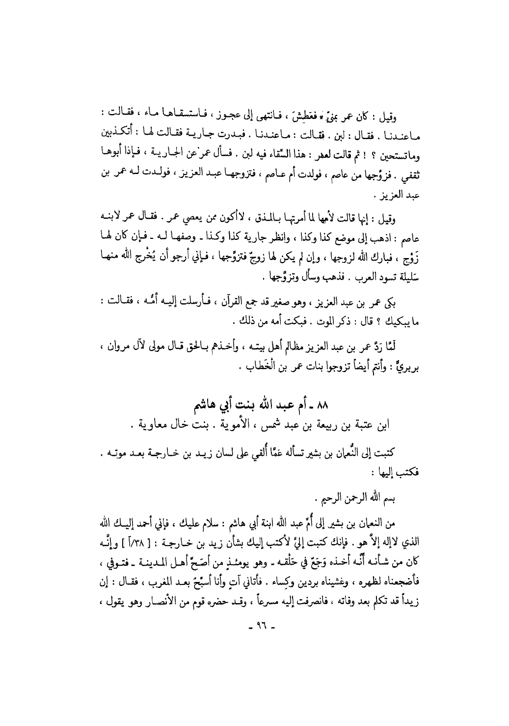 وقيل: إنها قالت لأمها لما أمرتها بالمذق، لا أكون ممن يعصي عمر. فقال عمر لابنه عاصم: اذهب إلى موضع كذا وكذا، وانظر جارية كذا وكذا وصفها له فإن كان لها زوج، فبارك الله لزوجها، وإن لم يكن لها زوج فتزوجها، فإني أرجو أن يخرج الله منها سليلة تسود العرب. فذهب وسأل وتزوجها. بكى عمر بن عبد العزيز، وهو صغير قد جمع القرآن، فأرسلت إليه أمه، فقالت: ما يبكيك؟ قال: ذكر الموت. فبكت أمه من ذلك. لما ورد عمر بن عبد العزيز مظالم أهل بيته، وأخذهم بالحق قال مولى لآل مروان، بربري: وأنتم أيضاً تزوجوا بنات عمر بن الخطاب.