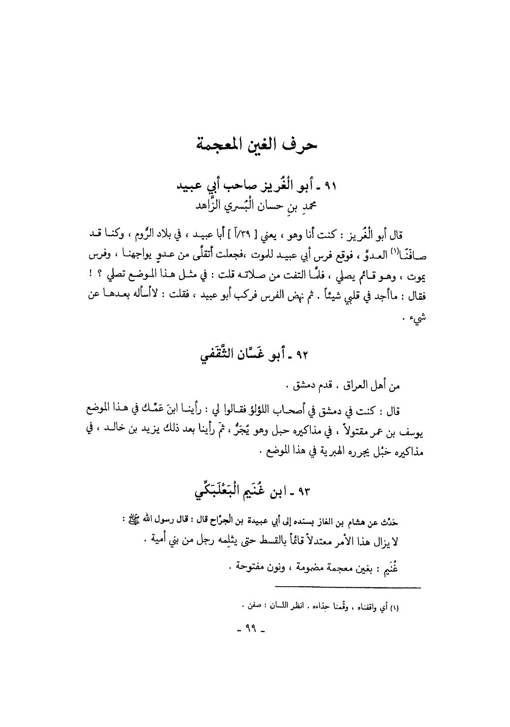 حدث عم هشام بن الغاز بسنده إلى أبي عبيدة بن الجراح قال: قال رسول الله صَلَّى اللهُ عَلَيْهِ وَسَلَّمَ: لا يزال هذا الأمر معتدلاً قائماً بالقسط حتى يثلمه رجل من بني أمية. غنيم: بغين معجمة مضمومة، ونون مفتوحة.