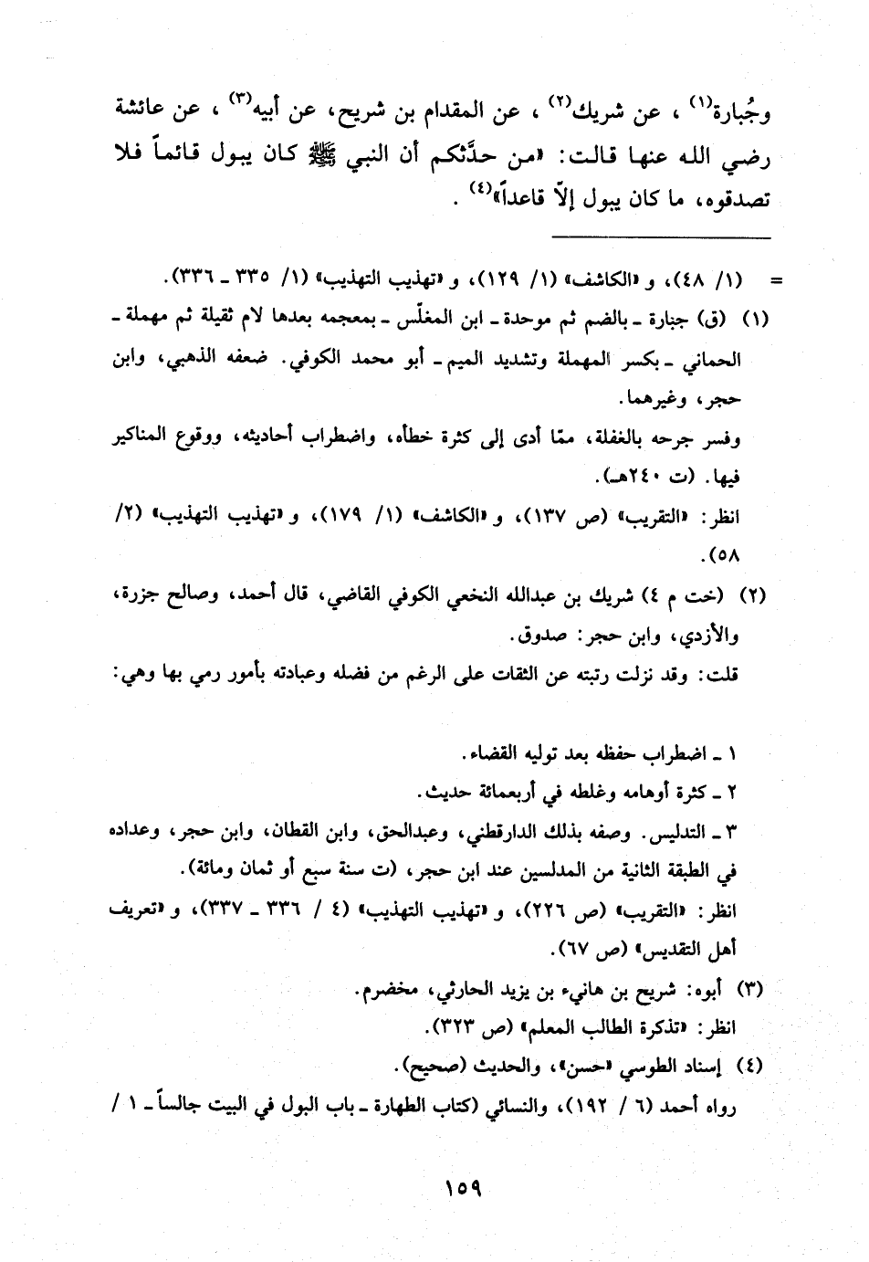 وَجُبَارَةُ عَنْ شَرِيكٍ عَنِ الْمِقْدَامِ بْنِ شُرَيْحٍ عَنْ أَبِيهِ عَنْ عَائِشَةَ رَضِيَ اللَّهُ عَنْهَا قَالَتْ مَنْ حَدَّثَكُمْ أَنَّ النَّبِيَّ صَلَّى اللَّهُ عَلَيْهِ وَسَلَّمَ كَانَ يَبُولُ قَائِمًا فَلا تُصَدِّقُوهُ مَا كَانَ يَبُولُ إِلا قَاعِدًا