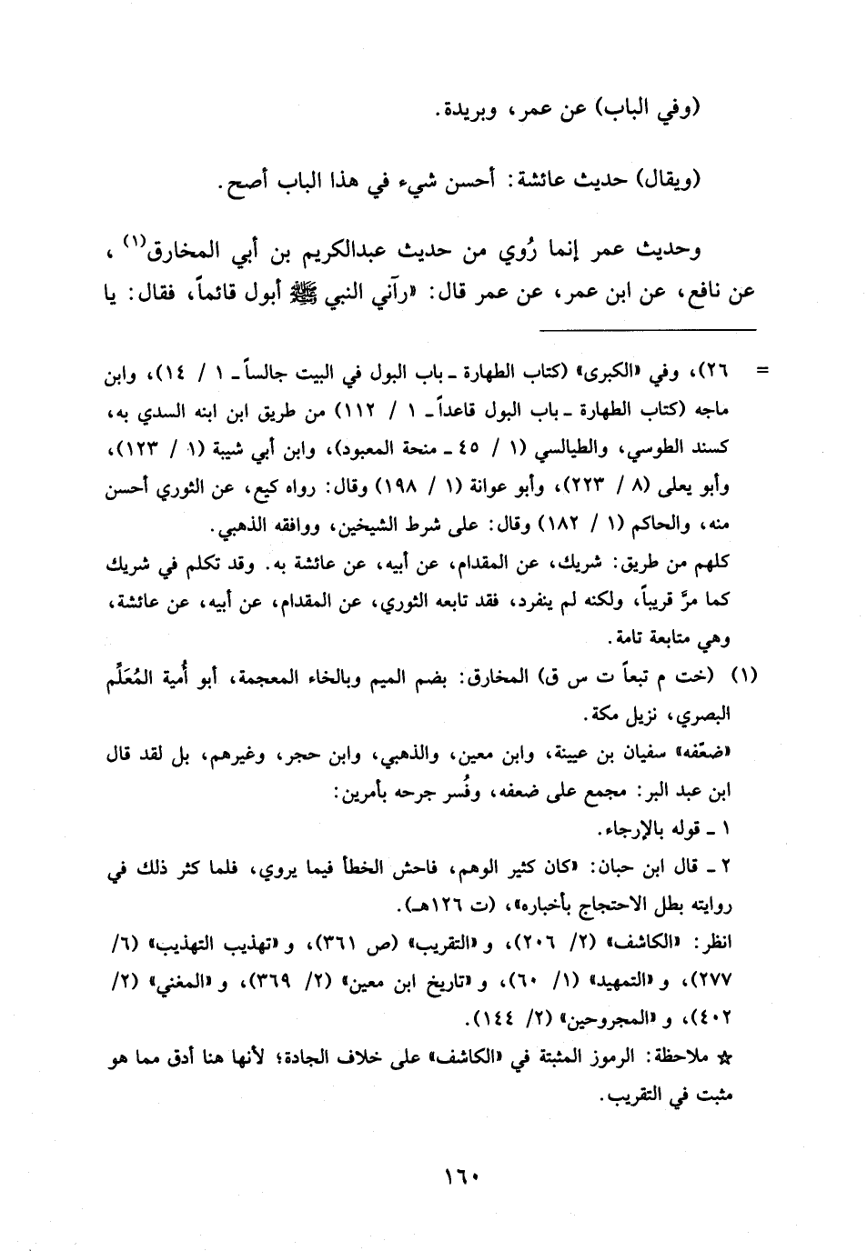 وَحَدِيثُ عُمَرَ إِنَّمَا رُوِيَ مِنْ حَدِيثِ عَبْدِ الْكَرِيمِ بْنِ أَبِي الْمُخَارِقِ عَنْ نَافِعٍ عَنِ ابْنِ عُمَرَ عَنْ عُمَرَ قَالَ رَآنِي النَّبِيُّ صَلَّى اللَّهُ عَلَيْهِ وَسَلَّمَ أَبُولُ قَائِمًا فَقَالَ يَا
