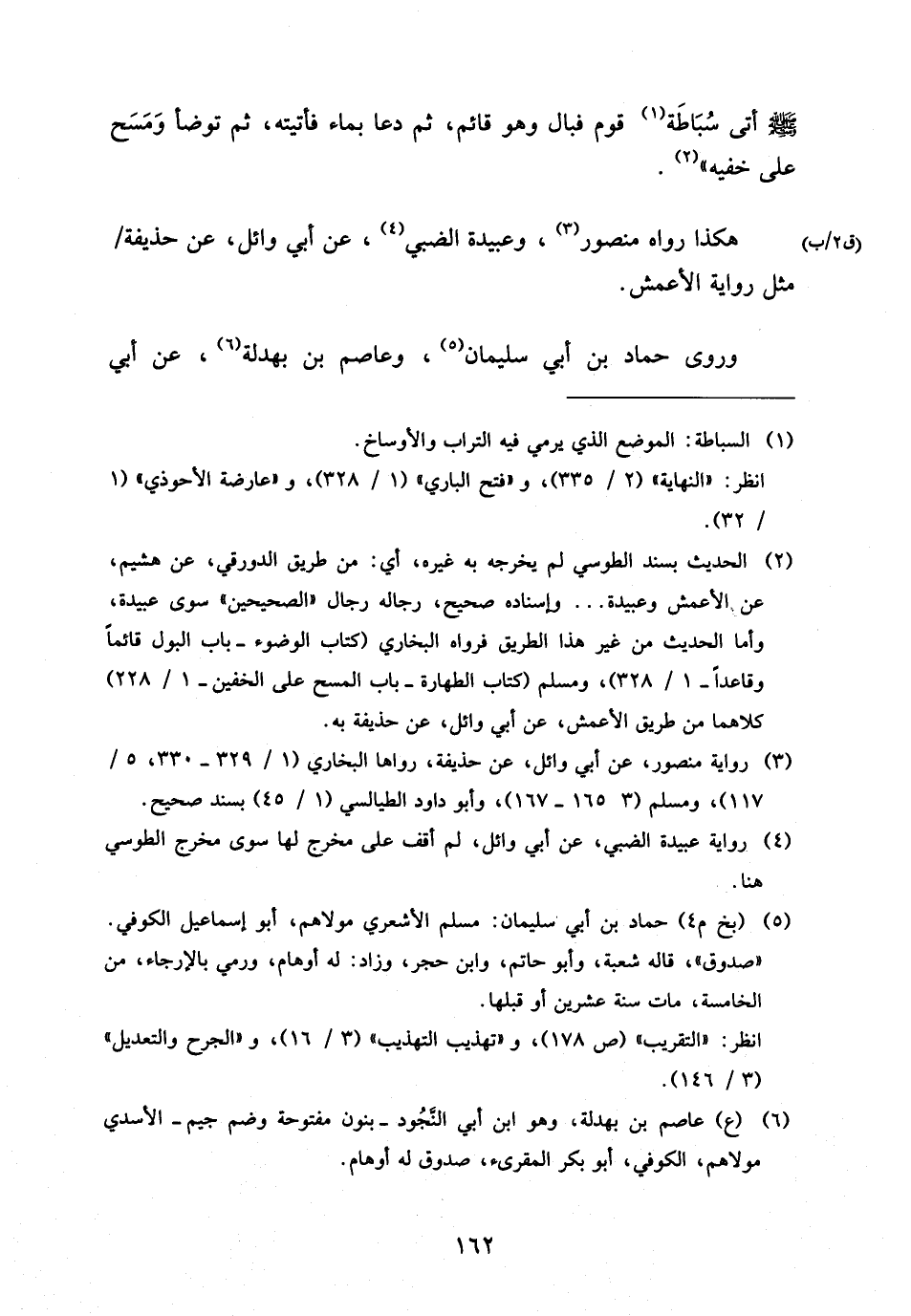 صَلَّى اللَّهُ عَلَيْهِ وَسَلَّمَ أَتَى سُبَاطَةَ قَوْمٍ فَبَالَ وَهُوَ قَائِمٌ ثُمَّ دَعَا بِمَاءٍ فَأَتَيْتُهُ ثُمَّ تَوَضَّأَ وَمَسَحَ عَلَى خُفَّيْهِ