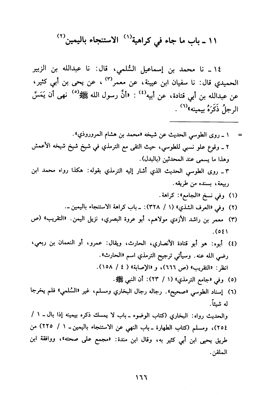 14 - نَا مُحَمَّدُ بْنُ إِسْمَاعِيلَ السُّلَمِيُّ قَالَ نَا عَبْدُ اللَّهِ بْنُ الزُّبَيْرِ الْحُمَيْدِيُّ قَالَ نَا سُفْيَان ابْن عُيَيْنَة عَن معمر عَن يحى بْنِ أَبِي كَثِيرٍ عَنْ عَبْدِ اللَّهِ بْنِ أَبِي قَتَادَةَ عَنْ أَبِيهِ أَنَّ رَسُولَ اللَّهِ صَلَّى اللَّهُ عَلَيْهِ وَسَلَّمَ نَهَى أَنْ يَمَسَّ الرَّجُلُ ذَكَرَهُ بِيَمِينِهِ