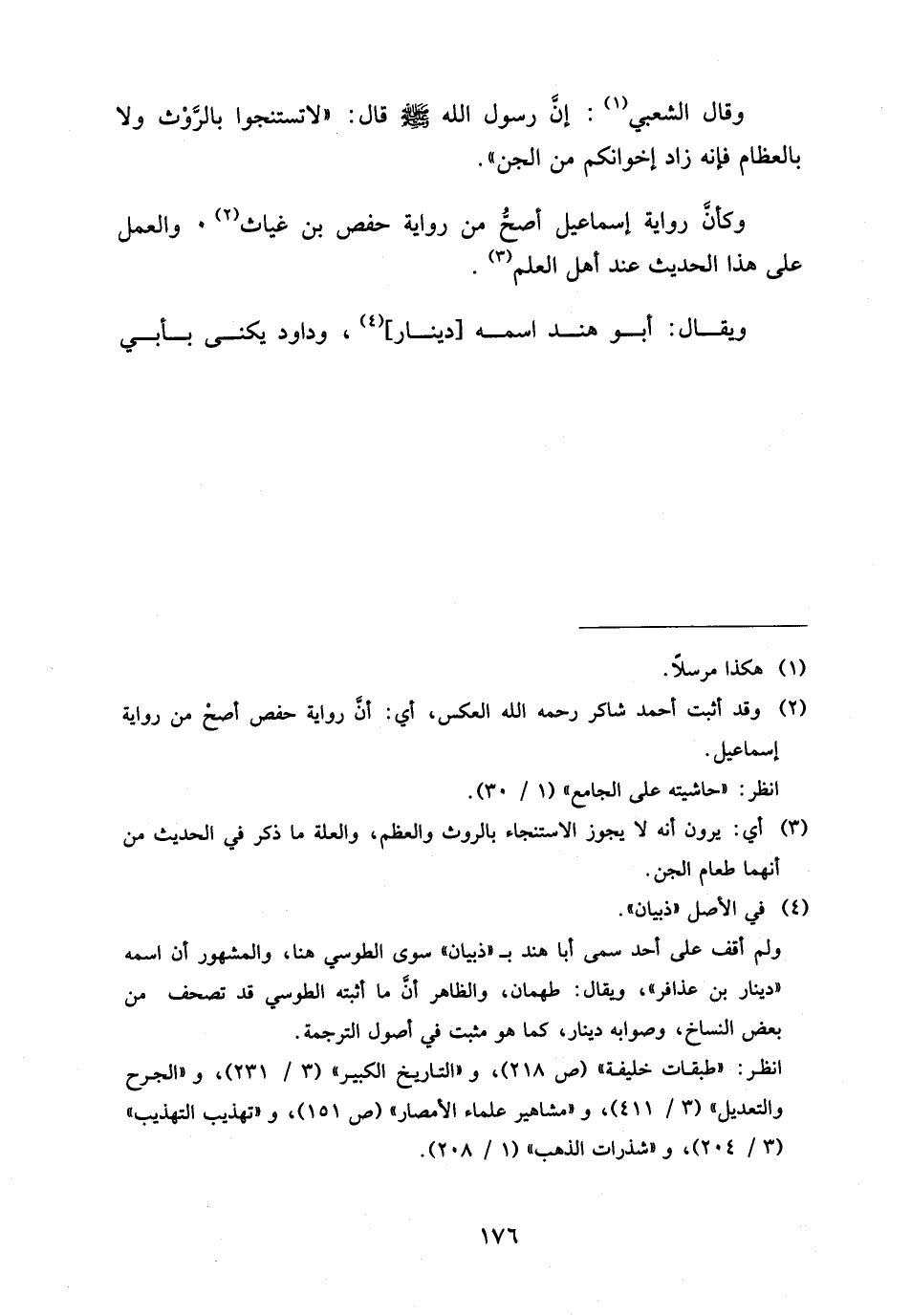 وَقَالَ الشَّعْبِيُّ إِنَّ رَسُولَ اللَّهِ صَلَّى اللَّهُ عَلَيْهِ وَسَلَّمَ قَالَ لَا تَسْتَنْجُوا بِالرَّوْثِ وَلا بِالْعِظَامِ فَإِنَّهُ زَادُ إِخْوَانِكُمْ مِنَ الْجِنِّ