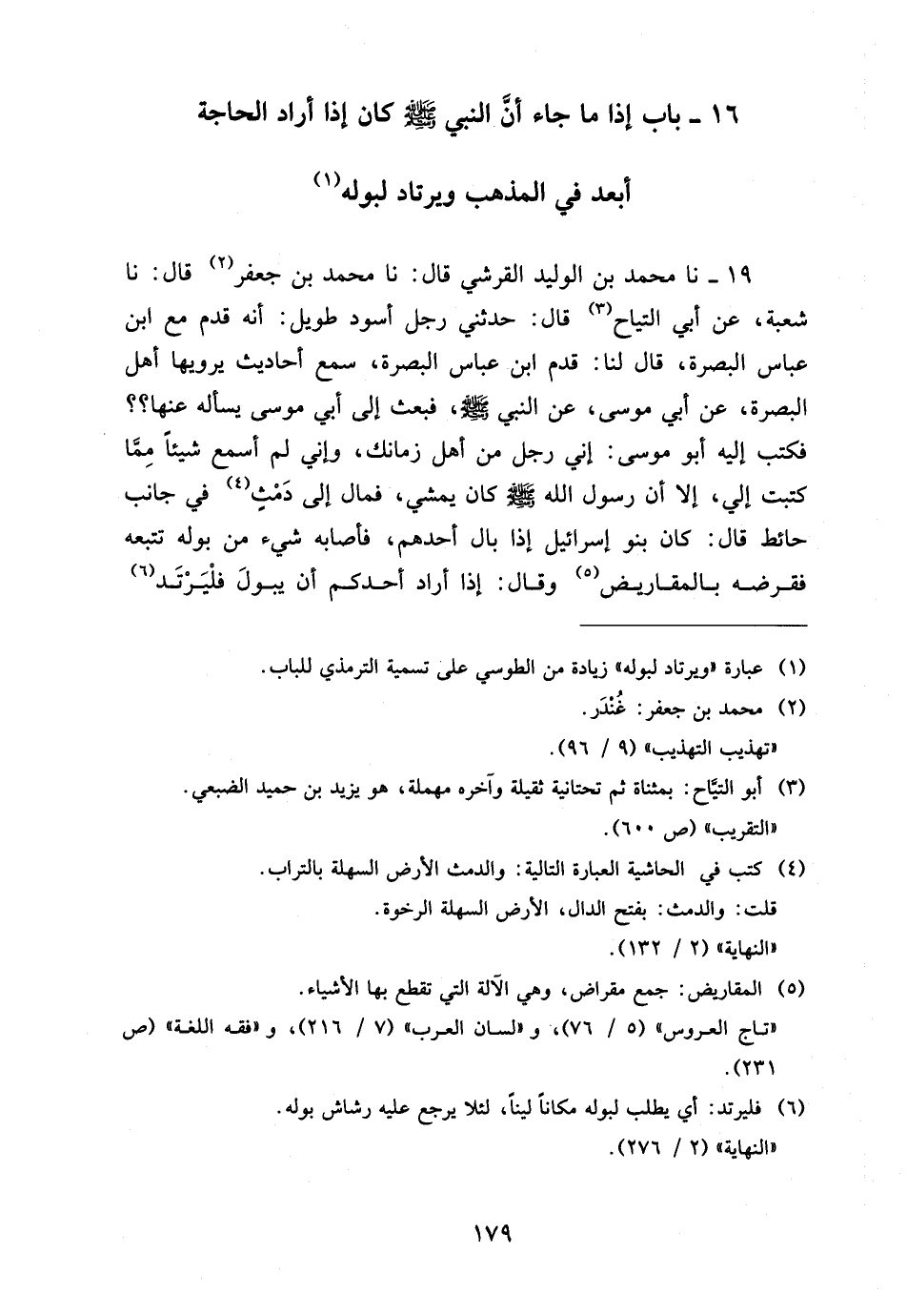 19 - نَا مُحَمَّدُ بْنُ الْوَلِيدِ الْقُرَشِيُّ قَالَ نَا مُحَمَّدُ بْنُ جَعْفَرٍ قَالَ نَا شُعْبَةُ عَنْ أَبِي التَّيَّاحِ قَالَ حَدَّثَنِي رَجُلٌ أَسْوَدُ طَوِيلٌ أَنَّهُ قَدِمَ مَعَ ابْنِ عَبَّاسٍ الْبَصْرَةَ قَالَ لَنَا قَدِمَ ابْنُ عَبَّاسٍ الْبَصْرَةَ سَمِعَ أَحَادِيثَ يَرْوِيهَا أَهْلُ الْبَصْرَةِ عَنْ أَبِي مُوسَى عَنِ النَّبِيِّ صَلَّى اللَّهُ عَلَيْهِ وَسَلَّمَ فَبَعَثَ إِلَى أَبِي مُوسَى يَسْأَلُهُ عَنْهَا فَكَتَبَ إِلَيْهِ أَبُو مُوسَى إِنِّي رَجُلٌ مِنْ أَهْلِ زَمَانِكَ وَإِنِّي لَمْ أَسْمَعْ شَيْئًا مِمَّا كَتَبْتَ إِلَيَّ إِلا أَنَّ رَسُولَ اللَّهِ صَلَّى اللَّهُ عَلَيْهِ وَسَلَّمَ كَانَ يَمْشِي فَمَالَ إِلَى دَمْثٍ فِي جَانِبِ حَائِطٍ قَالَ كَانَ بَنُو إِسْرَائِيلَ إِذَا بَالَ أَحَدُهُمْ فَأَصَابَهُ شَيْءٌ مِنْ بَوْلِهِ تَتَبَّعَهُ فَقَرَضَهُ بِالْمَقَارِيضِ وَقَالَ إِذا أَرَادَ أحدكُم أَن يَبُول فليرتد