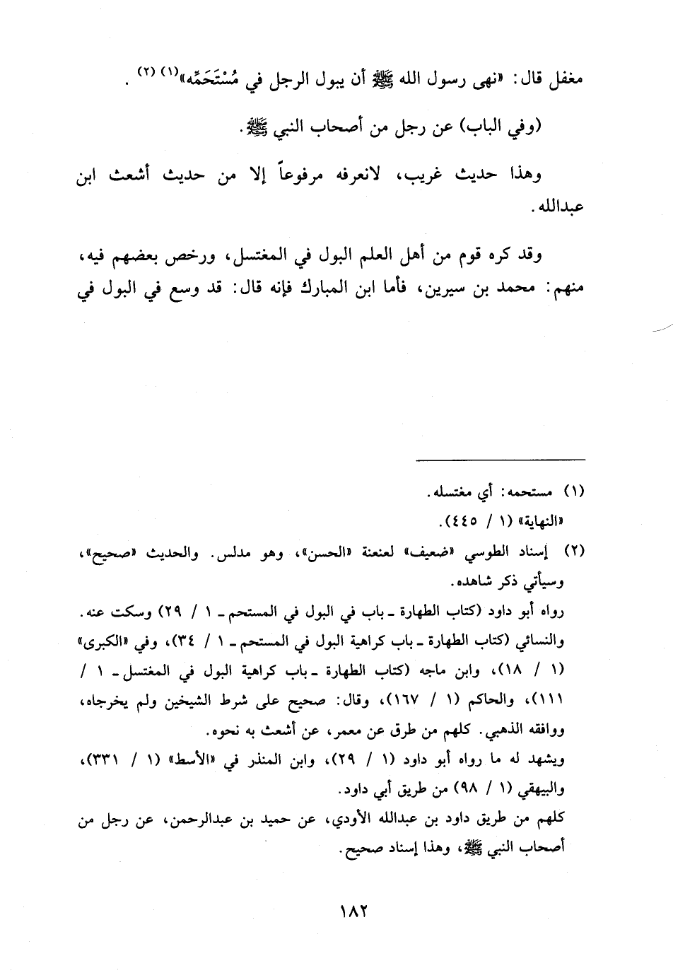 وَقَدْ كَرِهَ قَوْمٌ مِنْ أَهْلِ الْعِلْمِ الْبَوْلَ فِي الْمُغْتَسَلِ وَرَخَّصَ بَعْضُهُمْ فِيهِ مِنْهُمْ مُحَمَّدُ بْنُ سِيرِينَ فَأَمَّا ابْنُ الْمُبَارَكِ فَإِنَّهُ قَالَ قَدْ وُسِّعَ فِي الْبَوْلِ فِي