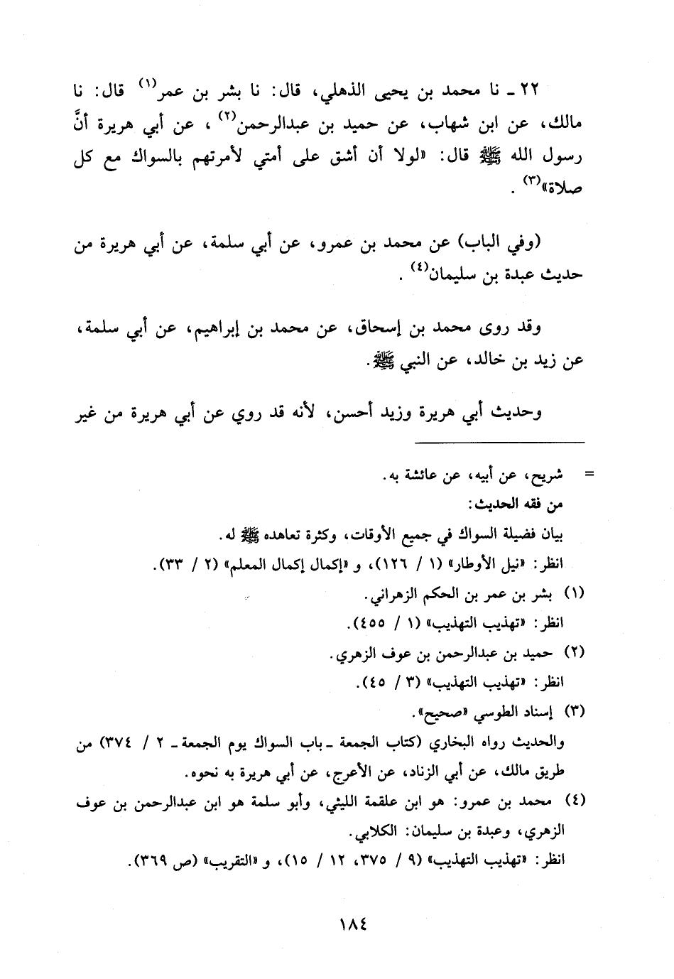 22 - نَا مُحَمَّدُ بْنُ يَحْيَى الذُّهْلِيُّ قَالَ نَا بِشْرُ بْنُ عُمَرَ قَالَ نَا مَالِكٌ عَنِ ابْنِ شِهَابٍ عَنْ حُمَيْدِ بْنِ عَبْدِ الرَّحْمَنِ عَنْ أَبِي هُرَيْرَةَ أَنَّ رَسُولَ اللَّهِ صَلَّى اللَّهُ عَلَيْهِ وَسَلَّمَ قَالَ لَوْلا أَنْ أَشُقَّ عَلَى أُمَّتِي لأَمَرْتُهُمْ بِالسِّوَاكِ مَعَ كُلِّ صَلاةٍ