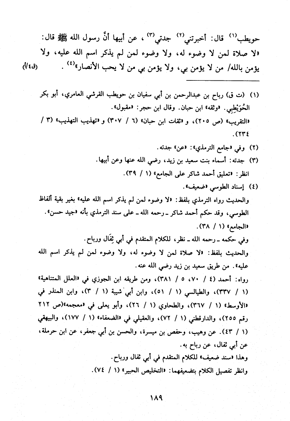 حُوَيْطِبٍ قَالَ أَخْبَرَتْنِي جَدَّتِي عَنْ أَبِيهَا أَنَّ رَسُولَ اللَّهِ صَلَّى اللَّهُ عَلَيْهِ وَسَلَّمَ قَالَ لَا صَلاةَ لِمَنْ لَا وُضُوءَ لَهُ وَلا وُضُوءَ لِمَنْ لَمْ يُذْكَرِ اسْمُ اللَّهِ عَلَيْهِ وَلا يُؤْمِنُ بِاللَّهِ مَنْ لَا يُؤْمِنُ بِي وَلا يُؤْمِنُ بِي مَنْ لَا يُحِبُّ الأَنْصَارَ