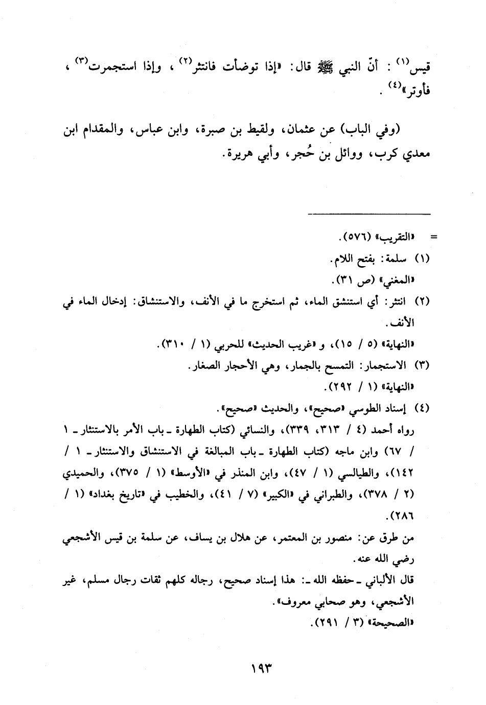 قَيْسٍ أَنَّ النَّبِيَّ صَلَّى اللَّهُ عَلَيْهِ وَسَلَّمَ قَالَ إِذَا تَوَضَّأْتَ فَانْتَثِرْ وَإِذَا اسْتَجْمَرْتَ فَأَوْتِرْ