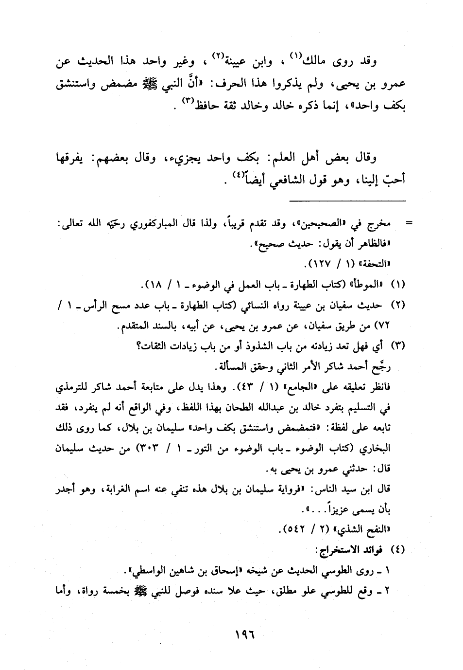 وَقَدْ رَوَى مَالِكٌ وَابْنُ عُيَيْنَةَ وَغَيْرُ وَاحِدٍ هَذَا الْحَدِيثَ عَنْ عَمْرِو بْنِ يَحْيَى وَلَمْ يَذْكُرُوا هَذَا الْحَرْفَ أَنَّ النَّبِيَّ صَلَّى اللَّهُ عَلَيْهِ وَسَلَّمَ مَضْمَضَ وَاسْتَنْشَقَ بِكَفٍّ وَاحِدٍ إِنَّمَا ذَكَرَهُ خَالِدٌ وَخَالِدٌ ثِقَةٌ حَافِظٌ