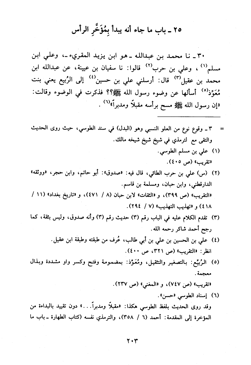 30 - نَا مُحَمَّدُ بْنُ عَبْدِ اللَّهِ هُوَ ابْنُ يزِيد المقريء وَعلي ابْن مُسْلِمٍ وَعَلِيُّ بْنُ حَرْبٍ قَالُوا نَا سُفْيَانُ بن عُيَيْنَة عَن عبد الله ابْن مُحَمَّدِ بْنِ عَقِيلٍ قَالَ أَرْسَلَنِي عَلِيُّ بْنُ حُسَيْنٍ إِلَى الرُّبَيِّعِ يَعْنِي بِنْتَ مُعَوِّذٍ أَسْأَلَهَا عَنْ وُضُوءِ رَسُولِ اللَّهِ صَلَّى اللَّهُ عَلَيْهِ وَسَلَّمَ فَذَكَرَتْ فِي الْوُضُوءِ وَقَالَتْ إِنَّ رَسُولَ اللَّهِ صَلَّى اللَّهُ عَلَيْهِ وَسَلَّمَ مَسَحَ بِرَأْسِهِ مُقبلا ومدبرا