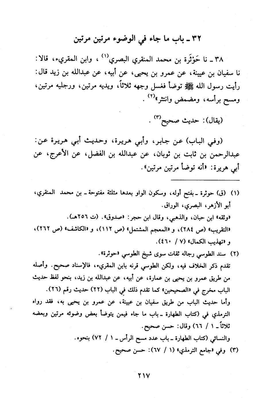 38 - نَا حَوْثَرَةُ بْنُ مُحَمَّدٍ الْمِنْقَرِيُّ الْبَصْرِيُّ وَابْنُ المقريء قَالا نَا سُفْيَانُ بْنُ عُيَيْنَةَ عَنْ عَمْرِو بْنُ يَحْيَى عَنْ أَبِيهِ عَنْ عَبْدِ اللَّهِ بْنِ زَيْدٍ قَالَ رَأَيْتُ رَسُولَ اللَّهِ صَلَّى اللَّهُ عَلَيْهِ وَسَلَّمَ تَوَضَّأَ فَغَسَلَ وَجْهَهُ ثَلاثًا وَيَدَيْهِ مَرَّتَيْنِ وَرِجْلَيْهِ مَرَّتَيْنِ وَمَسَحَ بِرَأْسِهِ وَمَضْمَضَ وَانْتَثَرَ
