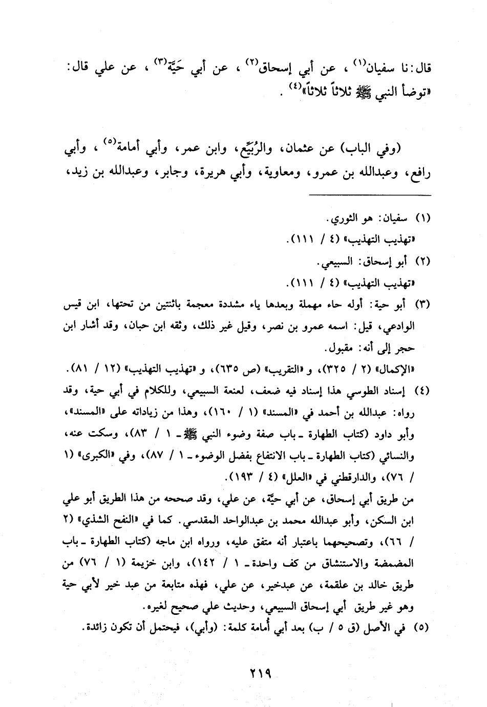 قَالَ نَا سُفْيَانُ عَنْ أَبِي إِسْحَاقَ عَنْ أَبِي حَيَّةَ عَنْ عَلِيٍّ قَالَ تَوَضَّأَ النَّبِيُّ صَلَّى اللَّهُ عَلَيْهِ وَسَلَّمَ ثَلاثًا ثَلاثًا