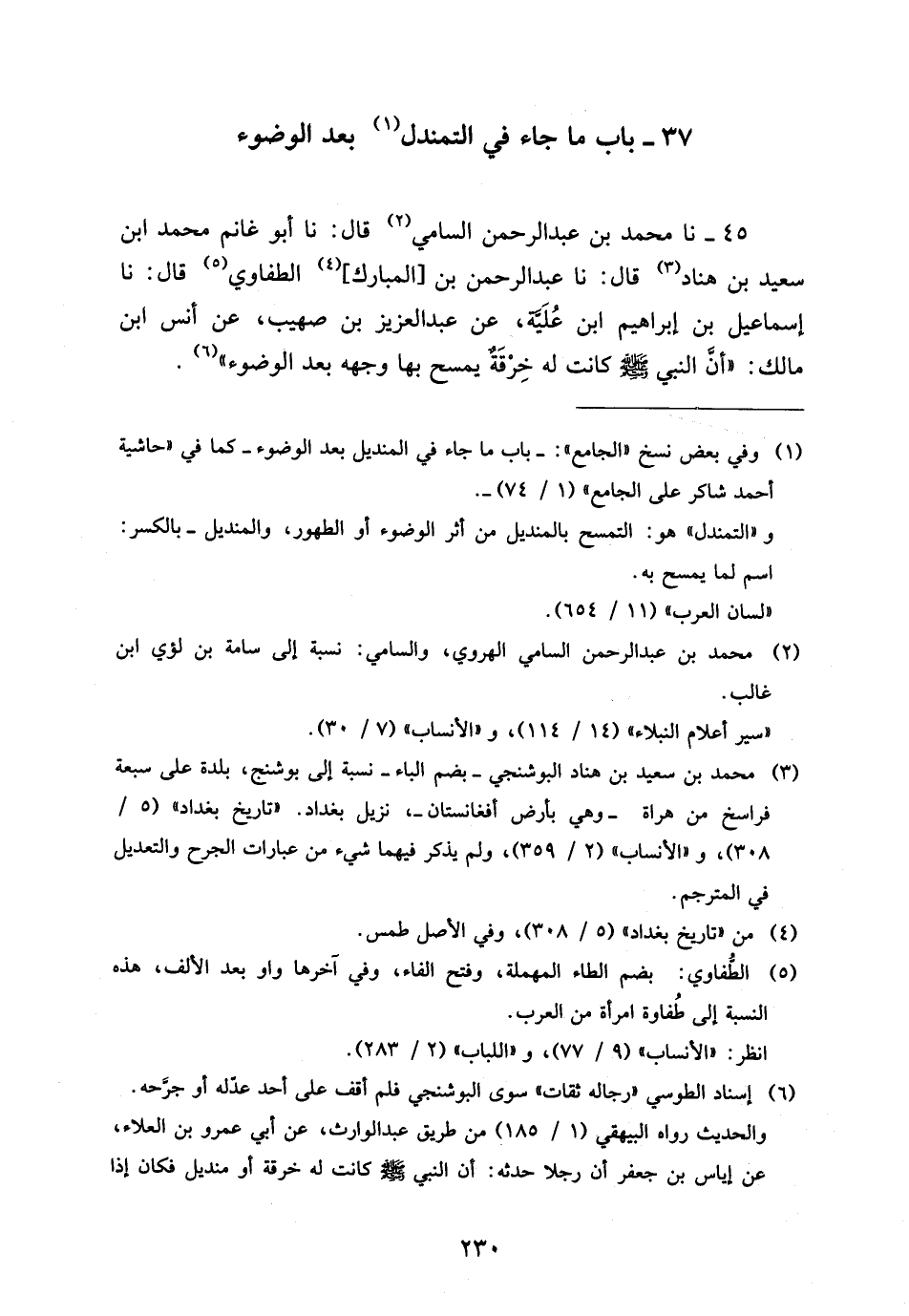45 - نَا مُحَمَّدُ بْنُ عَبْدِ الرَّحْمَنِ السَّامِيُّ قَالَ نَا أَبُو غَانِم مُحَمَّد ابْن سَعِيدِ بْنِ هَنَّادٍ قَالَ نَا عَبْدُ الرَّحْمَنِ بْنُ الْمُبَارَكِ الطُّفَاوِيُّ قَالَ نَا إِسْمَاعِيلُ بْنُ إِبْرَاهِيم ابْن عُلَيَّةَ عَنْ عَبْدِ الْعَزِيزِ بْنِ صُهَيْبٍ عَنْ أنس ابْن مَالِكٍ أَنَّ النَّبِيَّ صَلَّى اللَّهُ عَلَيْهِ وَسَلَّمَ كَانَتْ لَهُ خِرْقَةٌ يَمْسَحُ بِهَا وَجْهَهُ بَعْدَ الْوضُوء
