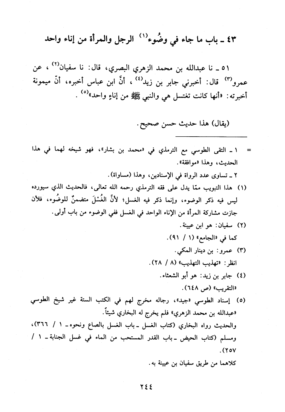 51 - نَا عَبْدُ اللَّهِ بْنُ مُحَمَّدٍ الزُّهْرِيُّ الْبَصْرِيُّ قَالَ نَا سُفْيَانُ عَنْ عَمْرٍو قَالَ أَخْبَرَنِي جَابِرُ بْنُ زَيْدٍ أَنَّ ابْنَ عَبَّاسٍ أَخْبَرَهُ أَنَّ مَيْمُونَةَ أَخْبَرَتْهُ أَنَّهَا كَانَتْ تَغْتَسِلُ هِيَ وَالنَّبِيُّ صَلَّى اللَّهُ عَلَيْهِ وَسَلَّمَ مِنْ إِنَاءٍ وَاحِدٍ