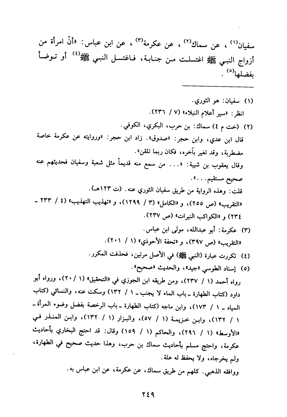 سُفْيَانَ عَنْ سِمَاكٍ عَنْ عِكْرِمَةَ عَنِ ابْنِ عَبَّاسٍ أَنَّ امْرَأَةً مِنْ أَزْوَاجِ النَّبِيِّ صَلَّى اللَّهُ عَلَيْهِ وَسَلَّمَ اغْتَسَلَتْ مِنْ جَنَابَةٍ فَاغْتَسَلَ النَّبِيُّ صَلَّى اللَّهُ عَلَيْهِ وَسَلَّمَ أَوْ تَوَضَّأ بفضلها