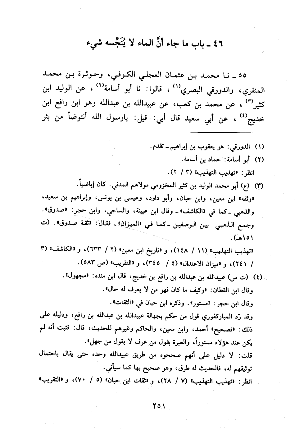 55 - نَا مُحَمَّدُ بْنُ عُثْمَانَ الْعِجْلِيُّ الْكُوفِيُّ وَحَوْثَرَةُ بْنُ مُحَمَّدٍ الْمِنْقَرِيُّ وَالدَّوْرَقِيُّ الْبَصْرِيُّ قَالُوا نَا أَبُو أُسَامَةَ عَن الْوَلِيد ابْن كَثِيرٍ عَنْ مُحَمَّدِ بْنِ كَعْبٍ عَنْ عُبَيْدِ اللَّهِ بْنِ عَبْدِ اللَّهِ وَهُوَ ابْنُ رَافِعِ ابْن خديج عَن أبي سعيد قَالَ أبي قِيلَ يَا رَسُولَ اللَّهِ أَنَتَوَضَّأُ مِنْ بِئْرِ