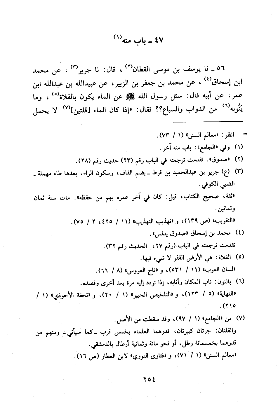 56 - نَا يُوسُفُ بْنُ مُوسَى الْقَطَّانُ قَالَ نَا جرير عَن مُحَمَّد ابْن إِسْحَاقَ عَنْ مُحَمَّدِ بْنِ جَعْفَرِ بْنِ الزُّبَيْرِ عَن عبيد الله بن عبد الله ابْن عُمَرَ عَنْ أَبِيهِ قَالَ سُئِلَ رَسُولُ اللَّهِ صَلَّى اللَّهُ عَلَيْهِ وَسَلَّمَ عَنِ الْمَاءِ يَكُونُ بِالْفَلاةِ وَمَا يَنُوبُهُ مِنَ الدَّوَابِّ وَالسِّبَاعِ فَقَالَ إِذَا كَانَ الْمَاءُ قُلَّتَيْنِ لَا يَحْمِلُ
