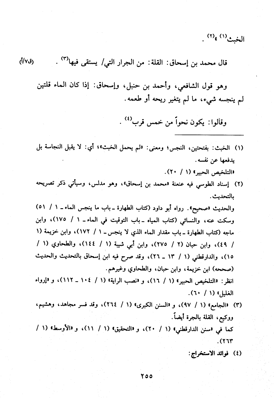 وَهُوَ قَوْلُ الشَّافِعِيِّ وَأَحْمَدَ بْنِ حَنْبَلٍ وَإِسْحَاقَ إِذَا كَانَ الْمَاءُ قُلَّتَيْنِ لَمْ يُنَجِّسْهُ شَيْءٌ مَا لَمْ يَتَغَيَّرْ رِيحُهُ أَوْ طَعْمُهُ