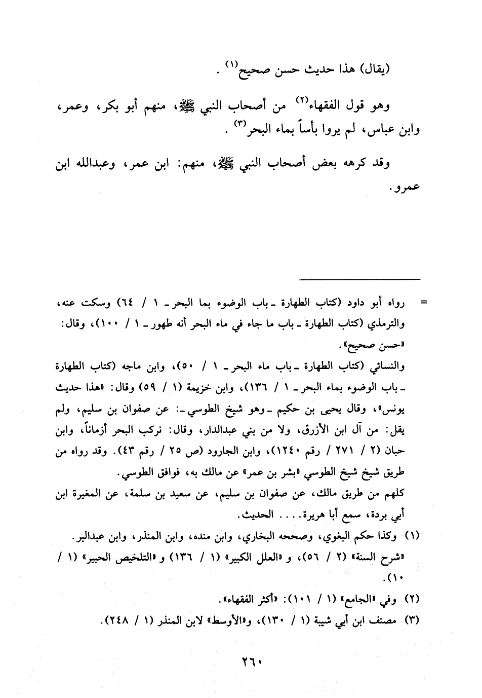 وَهُوَ قَوْلُ الْفُقَهَاءِ مِنْ أَصْحَابِ النَّبِيِّ صَلَّى اللَّهُ عَلَيْهِ وَسَلَّمَ مِنْهُمْ أَبُو بَكْرٍ وَعُمَرُ وَابْنُ عَبَّاسٍ لَمْ يَرَوْا بَأْسًا بِمَاءِ الْبَحْرِ