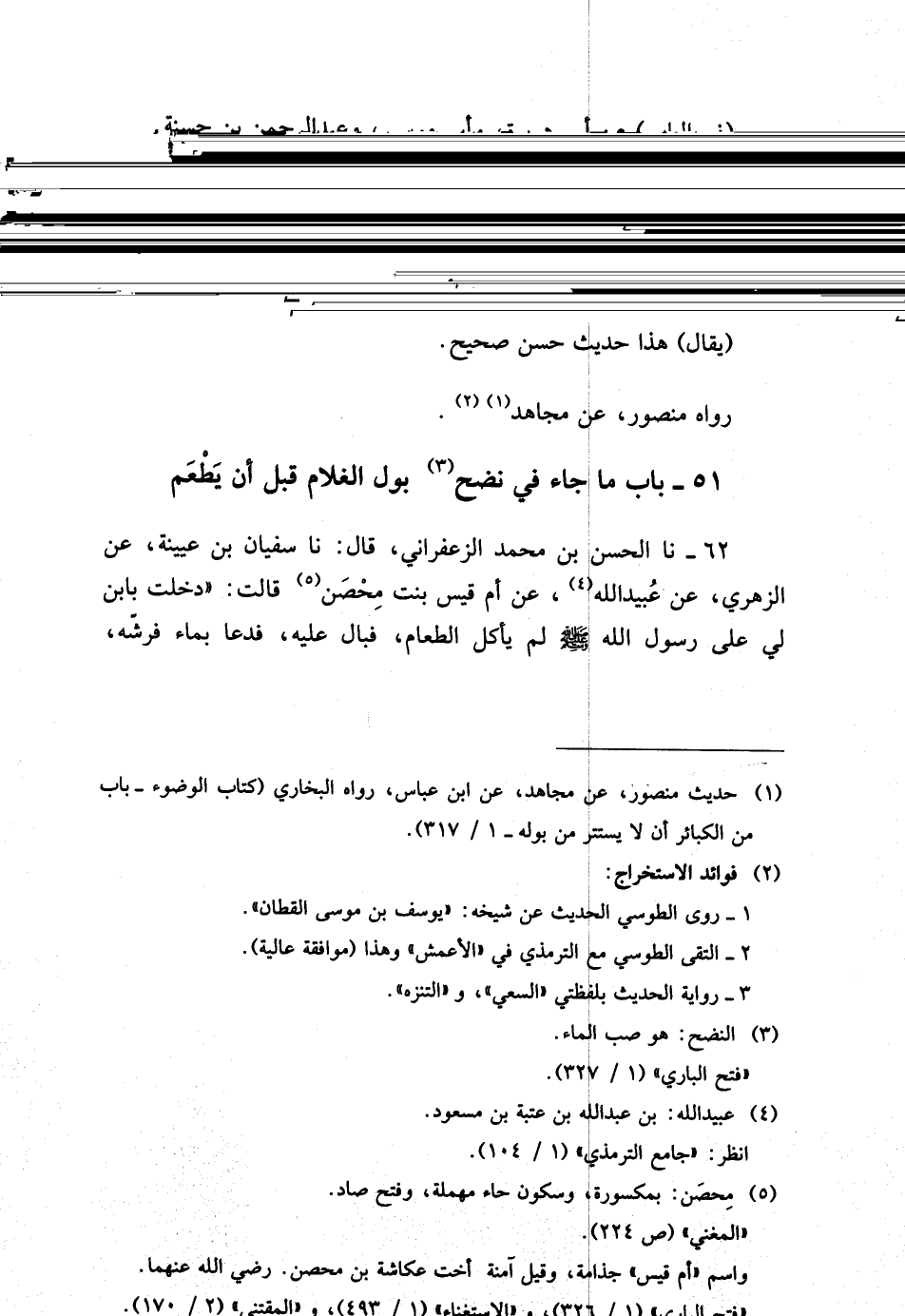 62 - نَا الْحَسَنُ بْنُ مُحَمَّدٍ الزَّعْفَرَانِيُّ قَالَ نَا سُفْيَانُ بْنُ عُيَيْنَةَ عَنِ الزُّهْرِيِّ عَنْ عُبَيْدِ اللَّهِ عَنْ أُمِّ قَيْسٍ بِنْتِ مِحْصَنٍ قَالَتْ دَخَلْتُ بِابْنٍ لِي عَلَى رَسُولِ اللَّهِ صَلَّى اللَّهُ عَلَيْهِ وَسَلَّمَ لَمْ يَأْكُلِ الطَّعَامَ فَبَالَ عَلَيْهِ فَدَعَا بِمَاءٍ فَرَشَّهُ