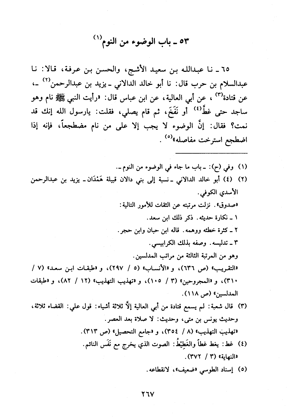 65 - نَا عَبْدُ اللَّهِ بْنُ سَعِيدٍ الأَشَجُّ وَالْحَسَنُ بْنُ عَرَفَةَ قَالا نَا عَبْدُ السَّلامِ بْنُ حَرْبٍ قَالَ نَا أَبُو خَالِدٍ الدَّالانِيُّ يَزِيدُ بْنُ عَبْدِ الرَّحْمَنِ عَنْ قَتَادَةَ عَنْ أَبِي الْعَالِيَةِ عَنِ ابْنِ عَبَّاسٍ قَالَ رَأَيْتُ النَّبِيَّ صَلَّى اللَّهُ عَلَيْهِ وَسَلَّمَ نَامَ وَهُوَ سَاجِدٌ حَتَّى غَطَّ أَوْ نَفَخَ ثُمّ قَامَ يُصَلِّي فَقُلْتُ يَا رَسُولَ اللَّهِ إِنَّكَ قَدْ نِمْتَ فَقَالَ إِنَّ الْوُضُوءَ لَا يَجِبُ إِلا عَلَى مَنْ نَامَ مُضْطَجِعًا فَإِنَّهُ إِذَا اضْطَجَعَ اسْتَرْخَتْ مَفَاصِلُهُ